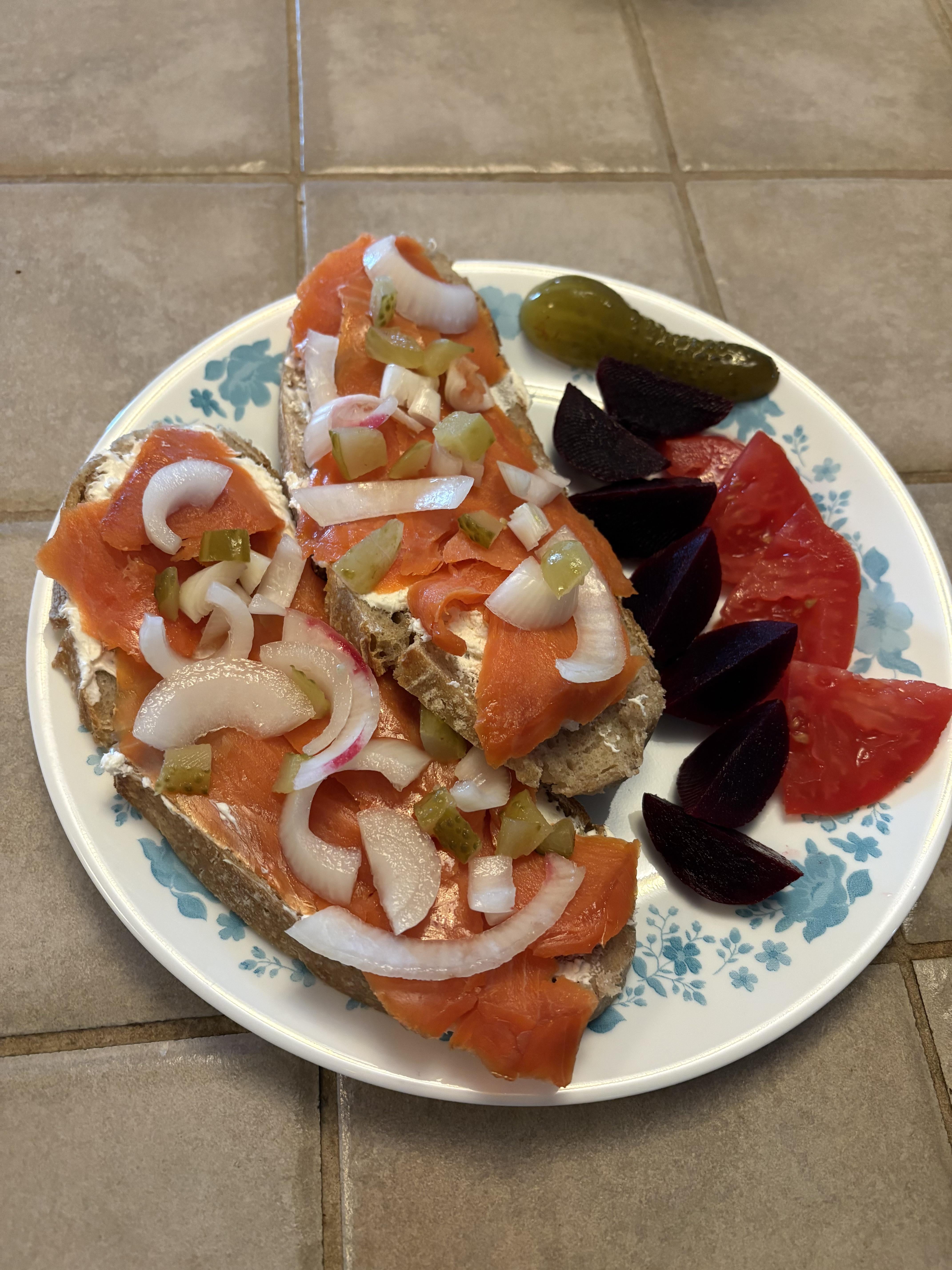 Smoked sockeye salmon lox on my homemade sourdough with sliced pickled beets, tomato, and fermented pickles (I didn’t have capers), with onions. Deliciousby xomeatlipsox Dining and Cooking