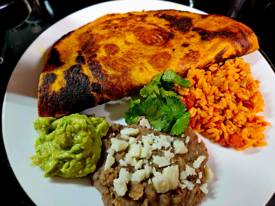 Also pictured: guacamole, Mexican rice, refried beans, and cilantro.