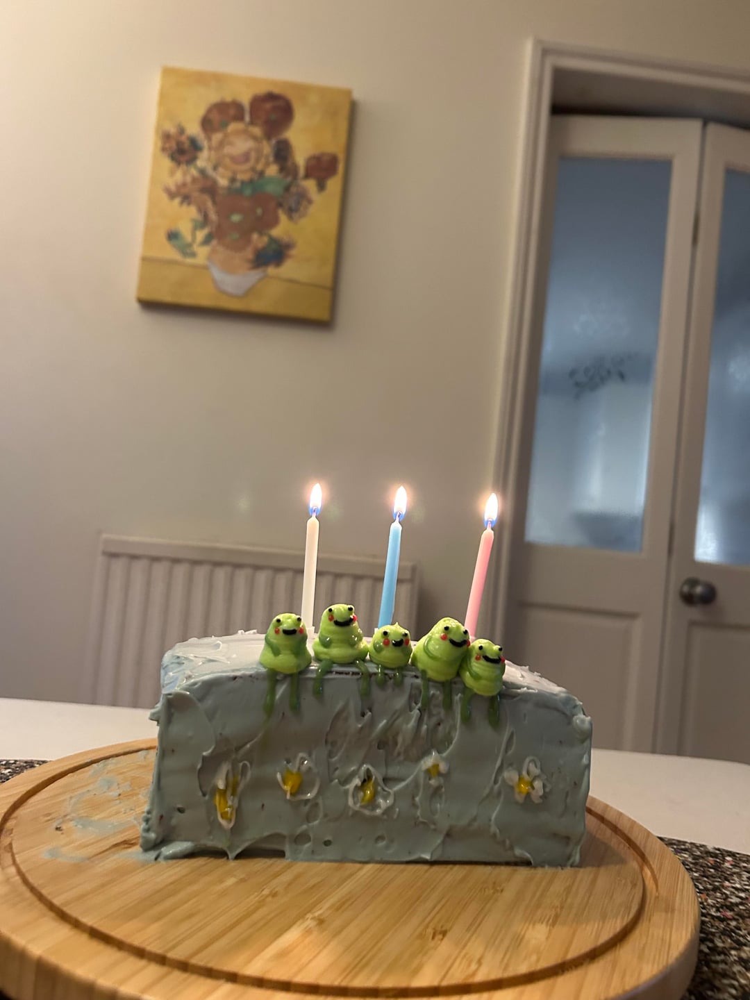 The frogs are adorable! Cute cake, alas that the flowers didn’t survive the heat 😭