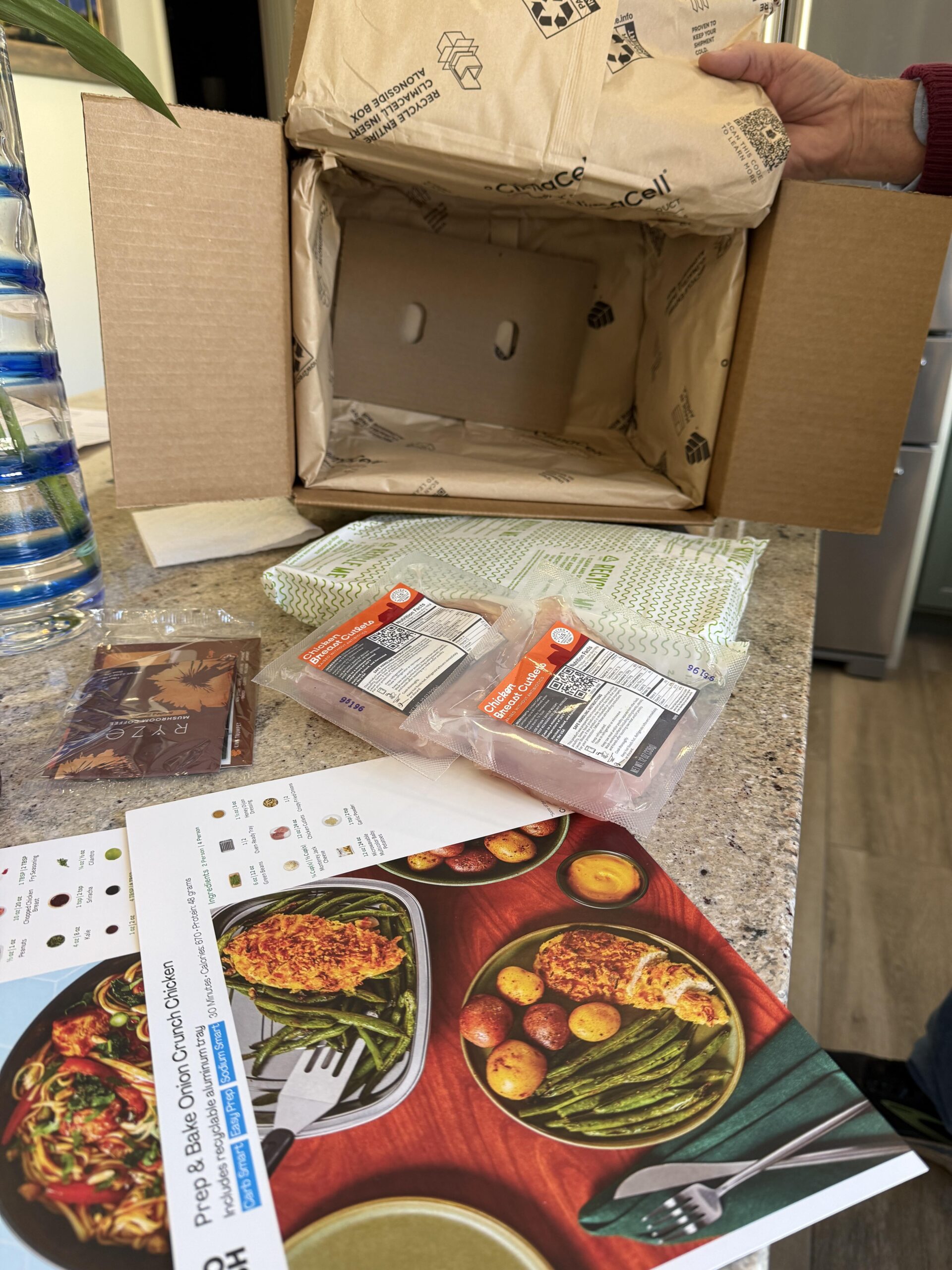 Our HF box was delivered today. Opened it to find NO meal prep brown bags, just two packages of chicken cutlets…