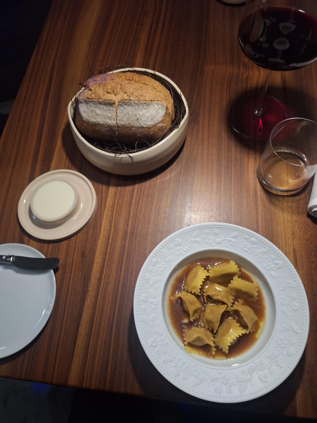 Primo: lamb ravioli in lamb broth with citrus, fresh bread, salted Italian butter