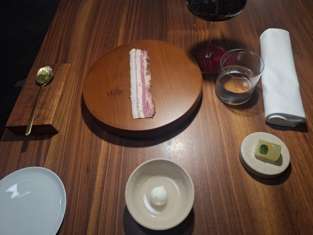 Gift from kitchen: fresh mozzarella ball, aged pork belly, relish, and melon marinated in a liquer (I unfortunately don't remember the name of the melon or the liquer – I hadn't heard of either before).