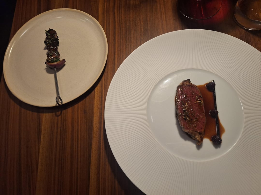 The venison was maybe the weakest part of the meal, but still quite good. The cook was great and the dolceforte was good. I do question the use of blackberries – there were only three and they were tiny (at least compared to the blackberries I'm used to in the US). It was about 6 bites of meat, so you're couldn't get a piece of fruit in each bite, and even if you did have a whole blackberry with a bite of meat you couldn't taste it. The vegetable skewer was also good and the smokiness complemented the dolceforte very well.