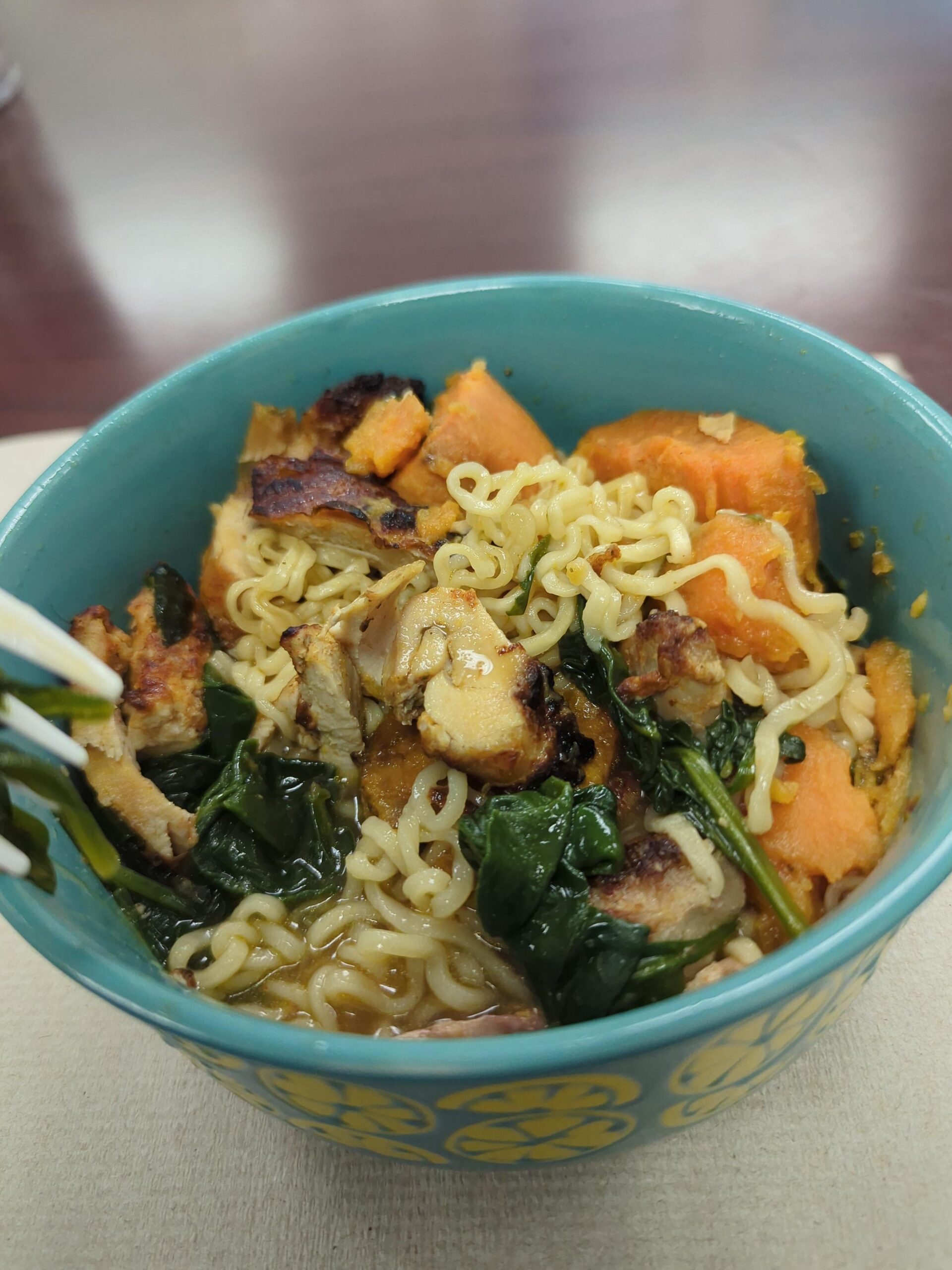 This is 5oz of chicken thigh (skinless/boneless), 100g of sweet potato, 50g spinach, 1.5cups of broth, Half pack of ramen for a total of 509 calories by Haunting_Material_83 Dining and Cooking