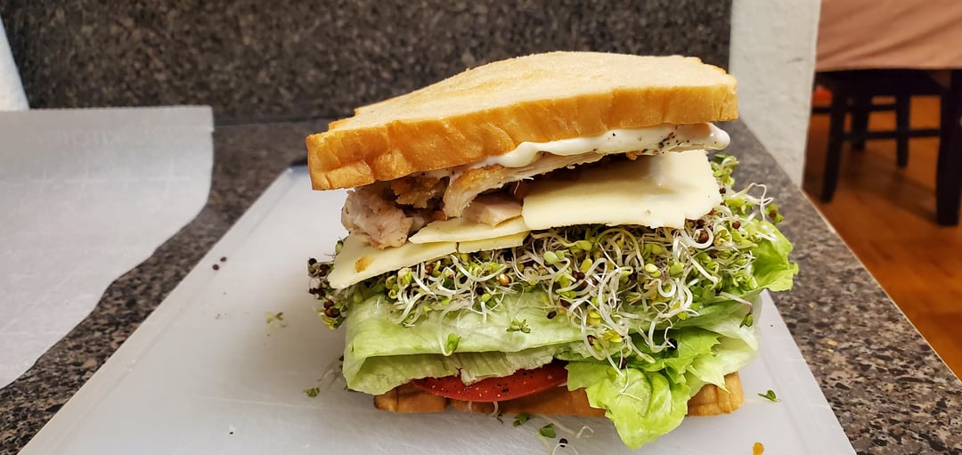 When I was growing up there was a night in which the meal was called Mustgo. It took quite a few years to realize what my mom meant. Lol. This is homemade shokupan with homegrown broccoli sprouts, lettuce, leftover fried chicken, white American, tomato, iceberg lettuce, SnP and mayonnaise (Hellman's for this application although I consider Duke's an equal but for different purposes). Pictures are for clarity or discussion. Doggo added for the guy with the Aussie that posts sandwiches with frequency.