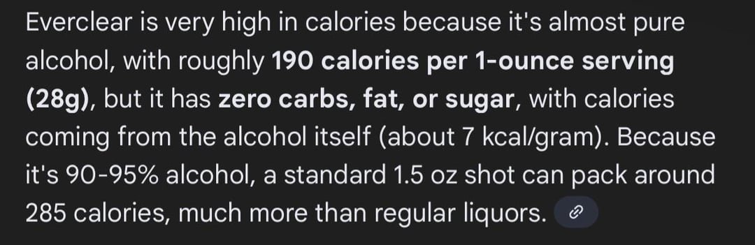 How can this minuscule amount of liquid (190 proof) be almost 200 calories?? And the shot next to it would be around 250? That would make it so much higher in calories then pure olive oil. This has always been my drink of choice when going out because in my mind it was healthier to drink less. I would rather take a couple shots of this and call it a night rather than down 5 whole beers to feel tipsy. But this makes me rethink everything. Forgive me if this isn’t the right sub and you’re only allowed to post food. I went through the guidelines and I don’t think I’m breaking any rules