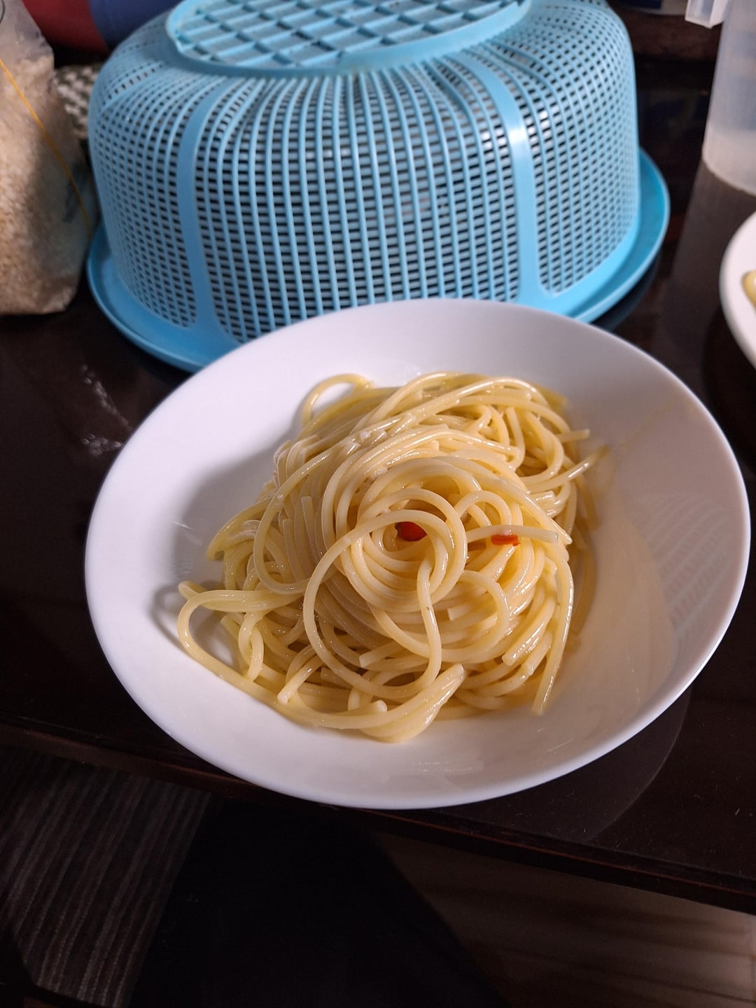 I cooked the spaghetti in al dente for about 10 minutes and while cooking, I prepared for the sauce, basically olive oil, 2 garlic cloves and 1 red pepper. I kinda screwed up the garlic when keeping the stove on low for a few minutes but at least it's golden brown. No parsley added though as I followed this exact recipe here. Gonna sharp the knife a bit more as these peppers in the picture aren't sliced well.