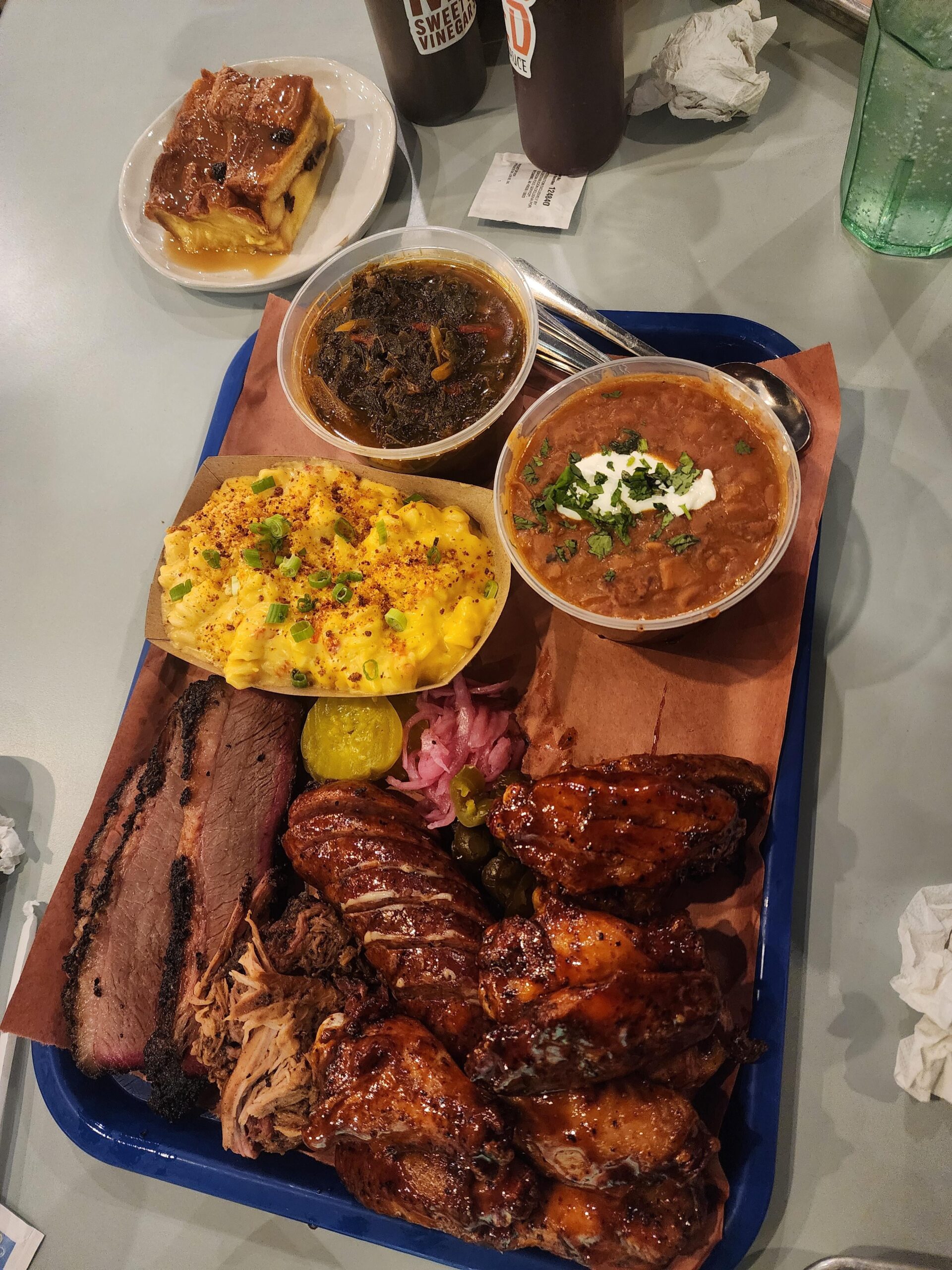 Feges BBQ (spring branch location) board. Tuesday nights you get brisket, pulled pork, sausage and ribs (they were out and substituted wings which were amazing!) Plus three sides ( collard greens, beans, and mac and cheese) and dessert for $50. Good deal. Brisket was slightly dry but tender…wings were the stand out and pulled pork was solid. Overall good bbq at a good price. Would recommend their Tuesday deal.