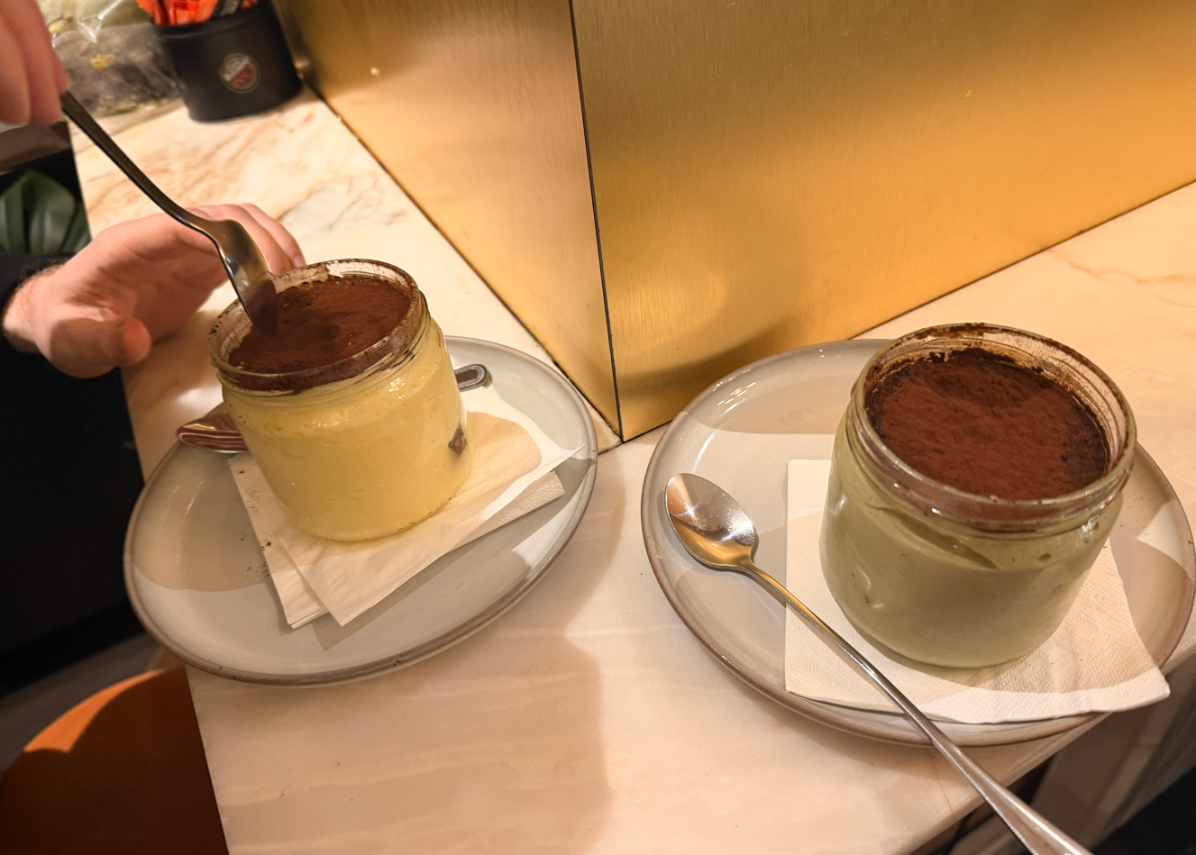 Their coffee tiramisu is creamy and served in a glass jar to help it hold its shape: light and fluffy, but structured. The pistachio version is denser and slightly sweeter.