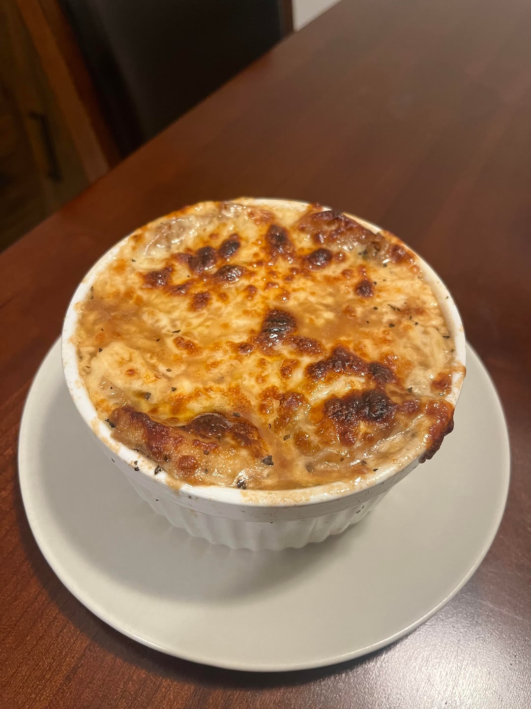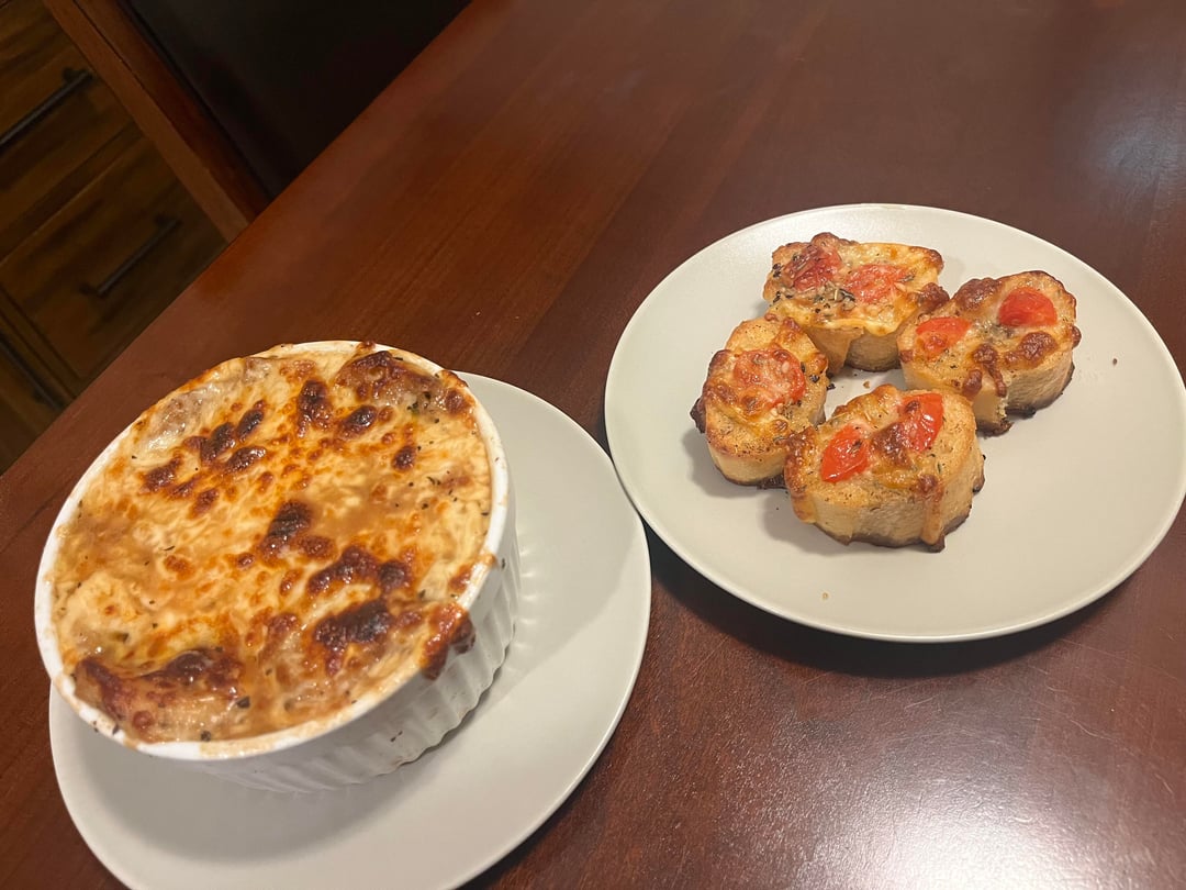Hi everyone! I’ve been lurking in this sub for a bit now and all of the French onion posts have made me want to try making it for myself. It’s supposed to get pretty cold here tomorrow and this has always been one of my favorites at restaurants in the wintertime. I took 3 sweet onions and 1 red onion I had leftover and sliced them as thin as I could to caramelize for about an hour. I couldn’t find sherry so I used some white wine to deglaze them and put it all into the crockpot with beef broth for about 6 hours. The house was smelling so good it was getting hard to wait at the end lol. I also couldn’t find Gruyère cheese so I settled with mozzarella and it still turned out better than any restaurant french onion I’ve had! The onions are really sweet and melt in your mouth. I’m definitely gonna start making this for myself now that I know how easy it is. I made some tomato bruschetta to go on the side with it.