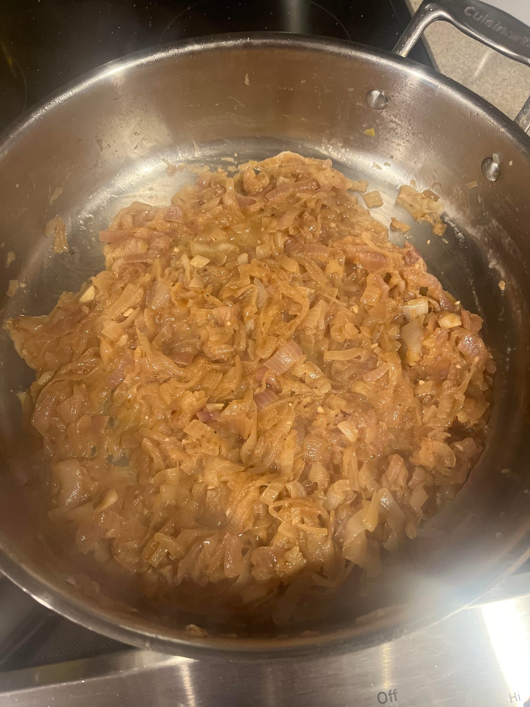 If I’m going to caramelize onions I’m doing 3 pounds. I decided that last time. I go pretty dark and takes almost an hour.