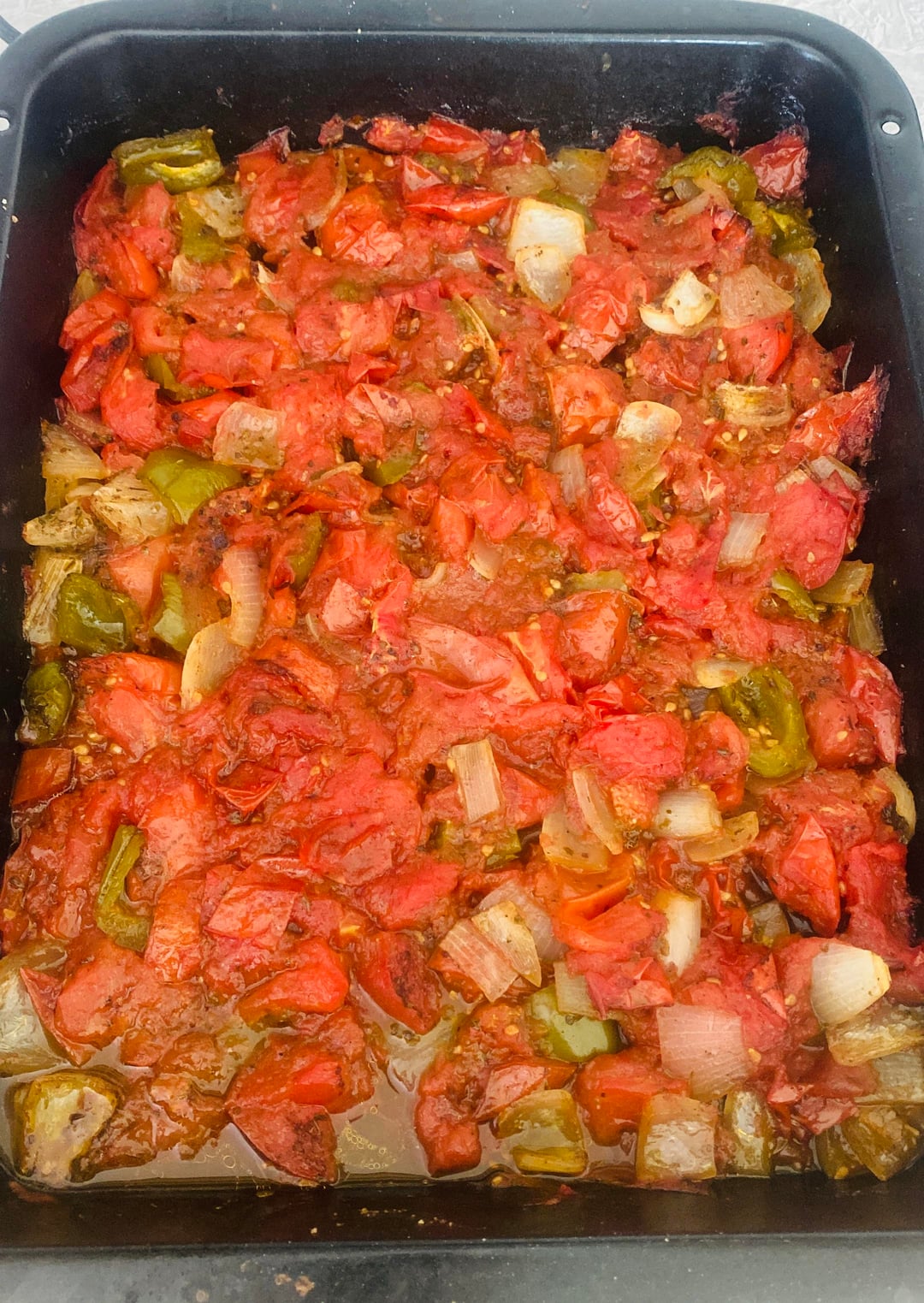 Step 1, get an oven pan, chop your tomatoes into big and chunky pieces, I like to add onion, bell peppers and chilli’s or jalapeños, whatever I have in the garden that’s fresh.