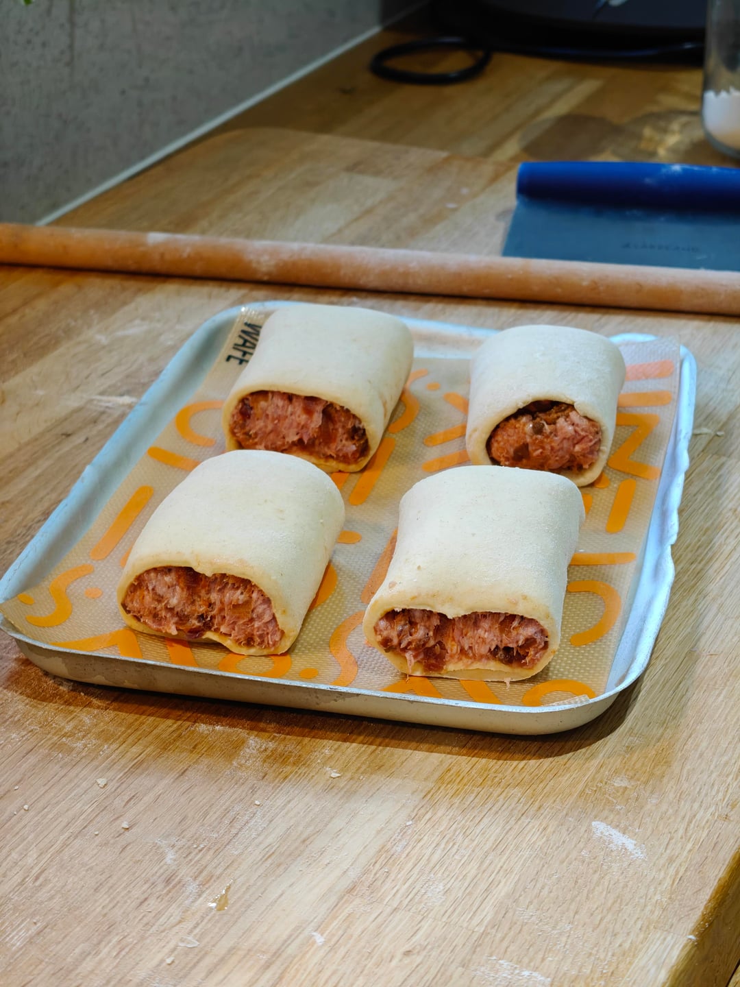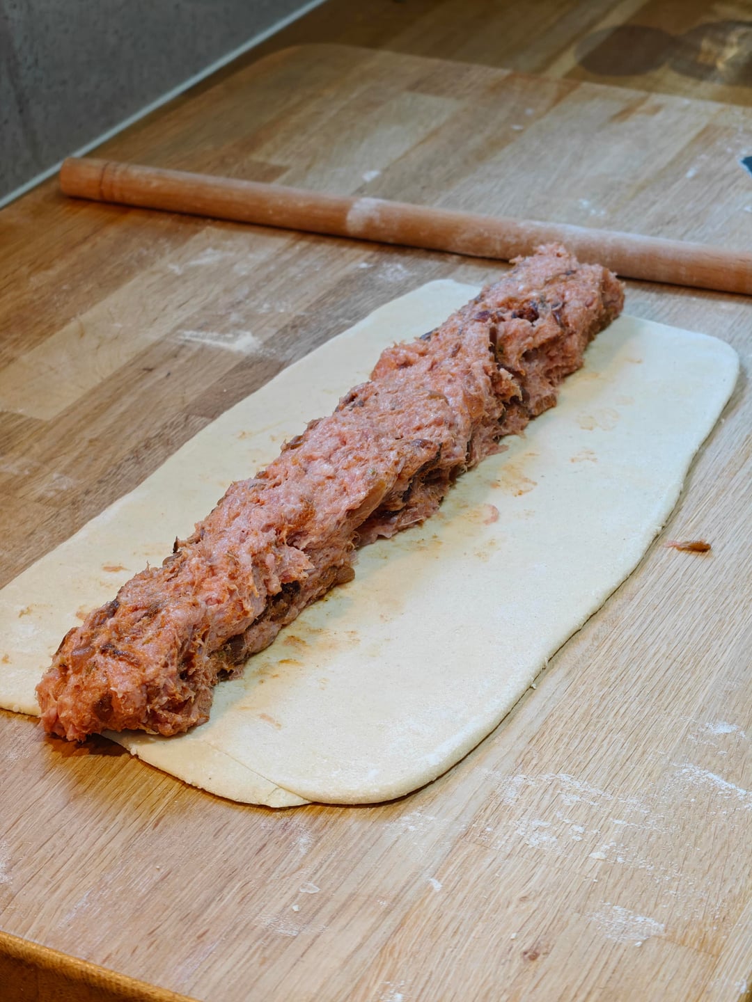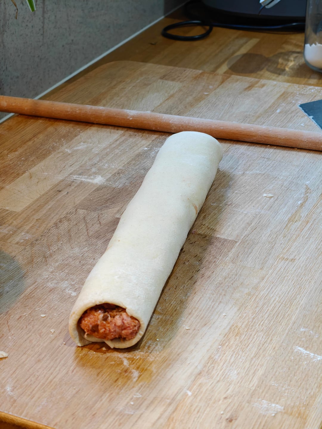 Had a bacon roll this morning and used the leftover bacon fat to fry some onions with red wine vinegar, sugar and paprika. Cooled it down and mixed it with a pack of honey roast sausagemeat.