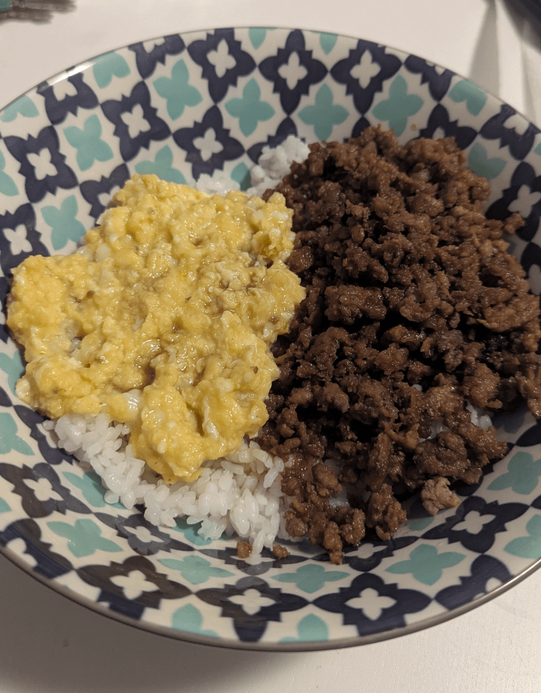 Used a mix of ground beef and pork for the meat crumble and two fresh eggs for the iri-tamago