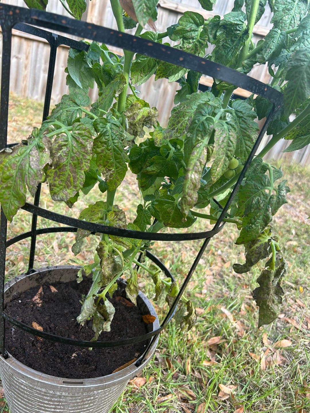 Hi guys I live in central Fl, few weeks ago decided to get a tomatoe plant. It had been doing fine, last week i went and cut some leaves that were touching the soil bc I was told that was not good. I went out to check on the plant today after a few days to water and notice that it has brown spots all over, its blooming a few new tomatoes and the leaves at the very top arent affected yet but most of the leaves have brown spots and some look like theyre dying what can i do for this? Im new to gardening, thank you!