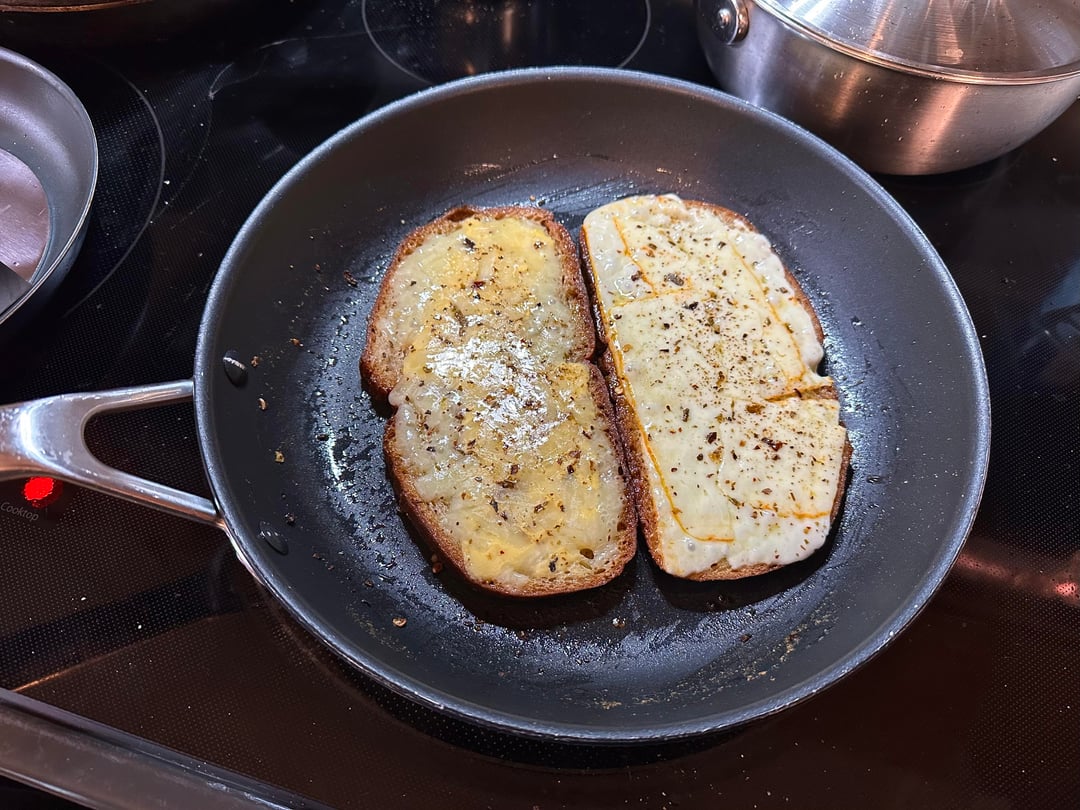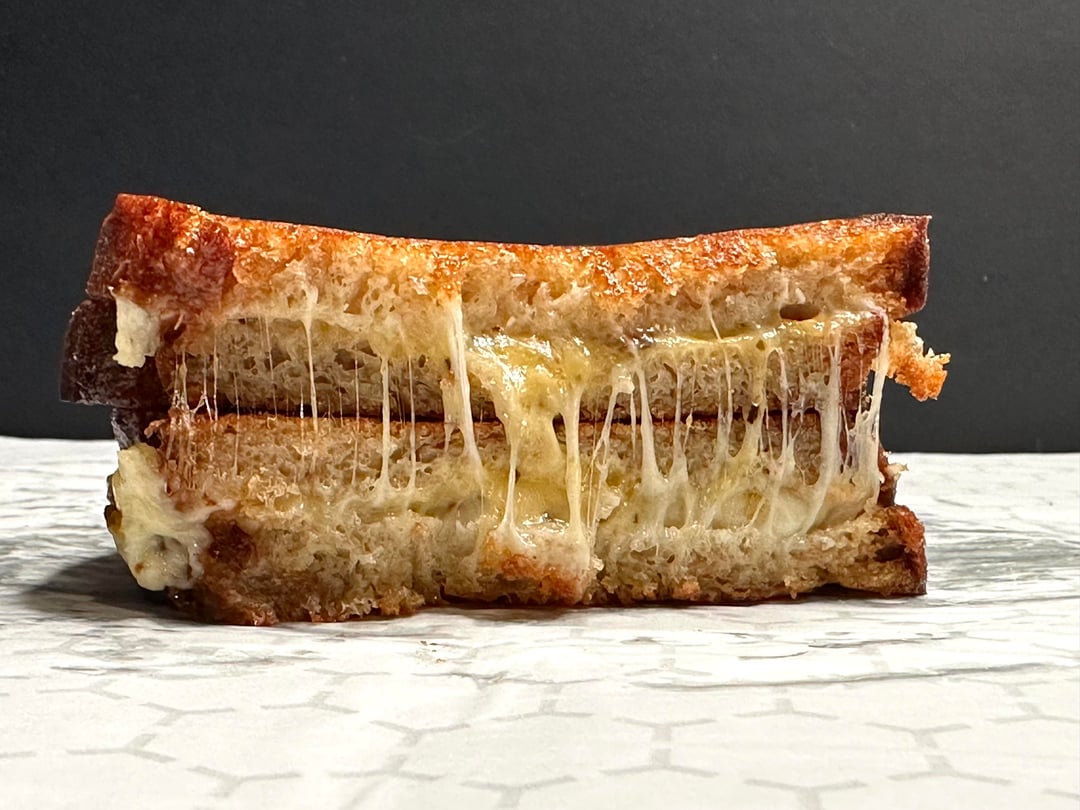 A quick grilled cheese for lunch today. Lots of Irish butter on homemade rye bread, Muenster, American, shredded sharp cheddar, a good sprinkle of Flatiron Hatch Green pepper flakes.