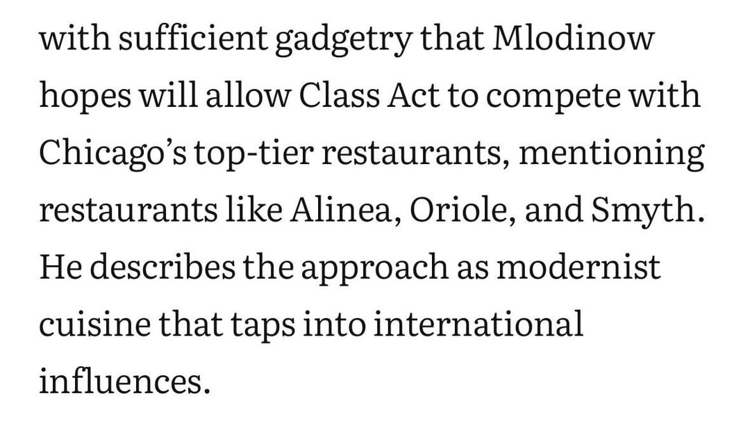 I’ve been to Class Act. I thought service was fantastic and the wine program was excellent. The concept was clunky and I think it hindered them. There were a couple of truly delicious courses – monkfish with lemongrass serrano broth and blueberries, a hazelnut cucumber milkshake with caviar, and dip and dot style ice cream with ants – but the menu didn’t feel particularly cohesive. There were issues with temperature, pacing, and seasoning. The highs and lows felt like they were coming out of two different restaurants. The space was nice, and I think if they leaned into their more abstract ideas rather than reference a bunch of separate cultures throughout the meal, they could deliver something I’d be interested in checking out.