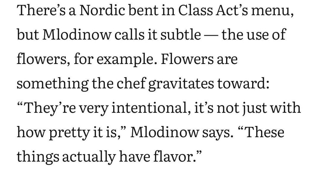 Class Act is a $230 tasting menu by chef Nicolai Mlodinow. If you haven’t heard of him it is because he hasn’t had much experience in the culinary scene other than doing pop ups at his apartment. Chicago Magazine rated the dinner half a star. I was curious what could earn it such a bad review and upon my investigation, the concept is so overly pompous about their “concept” it feels like a sitcom. Some of the quotes from this Chef are not just substances but borderline insulting as he insinuates doing something that other Chefs in the fine dining scene haven’t dared to do. I thought I would share some of the most “oh my god he really said that…” quotes to those who eat fine dinging regularly and might get a laugh. Also want to open up discussion for what you guys think about chefs who never went to culinary school, staged for a few days at random Michelin restaurants, open up pop ups and then try to taught themselves as on rivaling Michelin level cuisine. Especially with charging $230 (1-2 star prices).