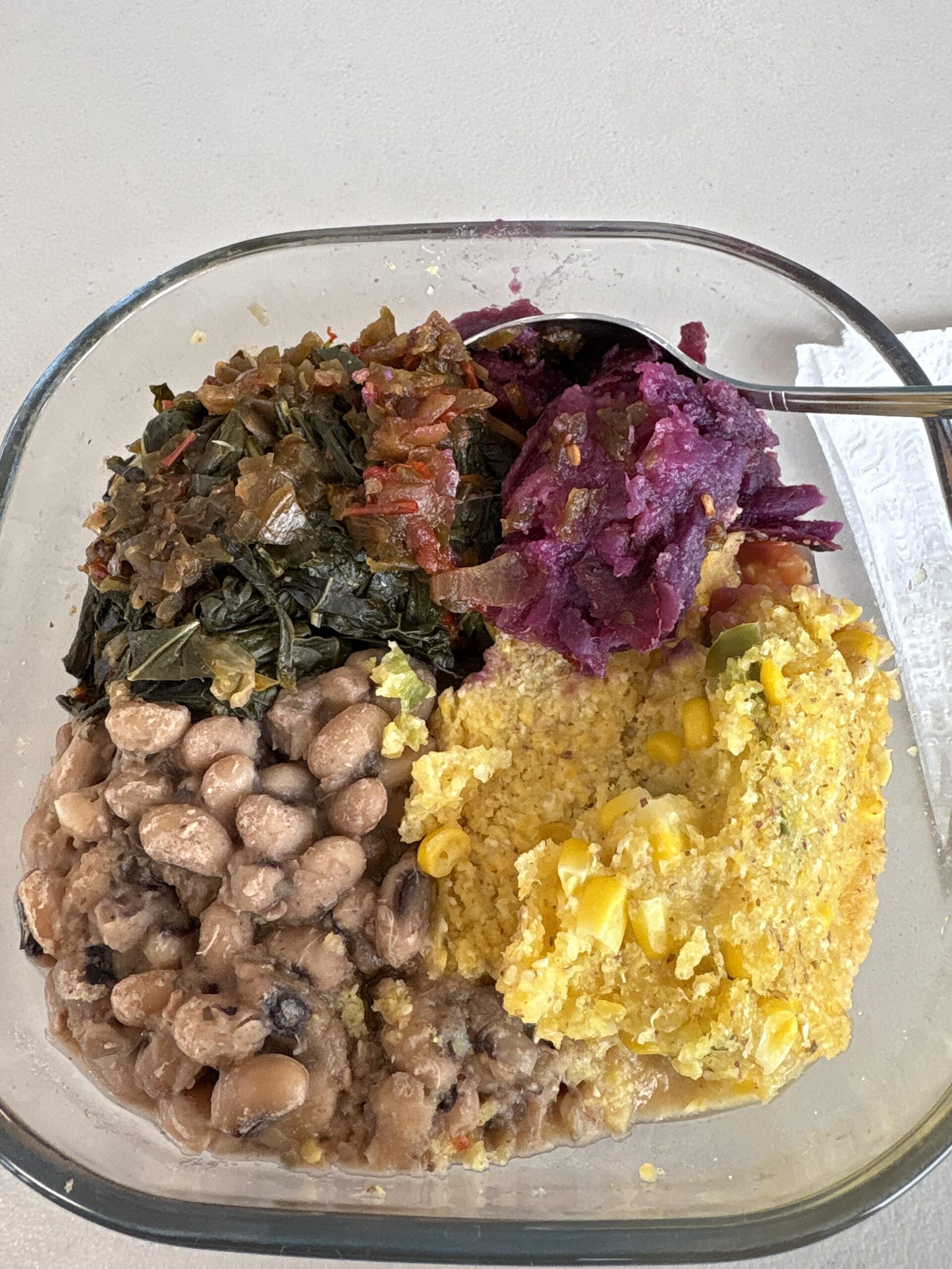 Corn bread pudding: preheat oven to 350. In a blender, add 12oz bag frozen sweet corn, handful of frozen cauliflower, 2 heaping tablespoons milled flaxseed, 1/2 cup silken tofu, and enough water to make a runny milkshake consistency. Add maple syrup and pinch of salt to taste. I like my cornbread sweet. Pour into a baking pan. Stir in another 12oz bag frozen sweet corn, 2 cups corn meal, and 2 small diced jalapeños. Bake for 1 hour uncovered or until middle is set.