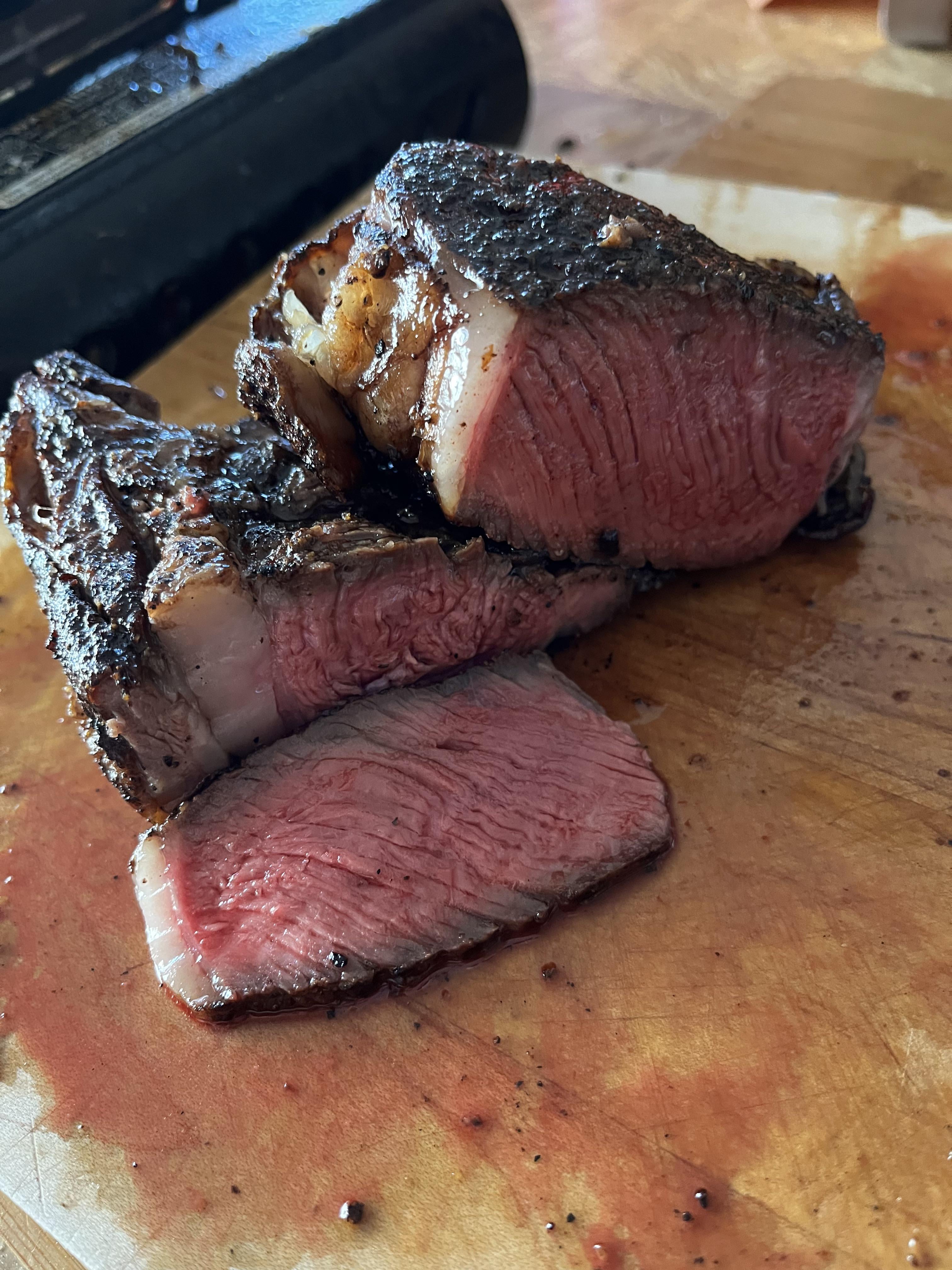 Reverse sear starts in a convection toaster oven at 250 until it gets to 105. Rest for a few mins while I open every window, crack the garage open a few inches, close every bedroom and bathroom door, turn on every ceiling fan, and get the pan screaming hot. Sear for 30 secs each side including edges with an 8lb steak weight pressing down on it. Remove the ribeye cap and sear that exposed fat. Eat that. Oh yeah then take this pic.
