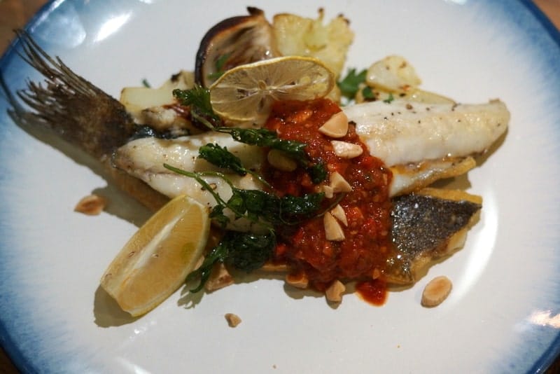 My wife and I both really like branzino and we order it almost every time we see it on a menu. This was no exception. Fenice’s branzino ($30) is a complex dish of wonderfully flaky tail-on branzino with braised fennel, roasted cauliflower, Marcona almonds, crispy greens, lemon, and a rich and peppery Spanish-style Romesco sauce.