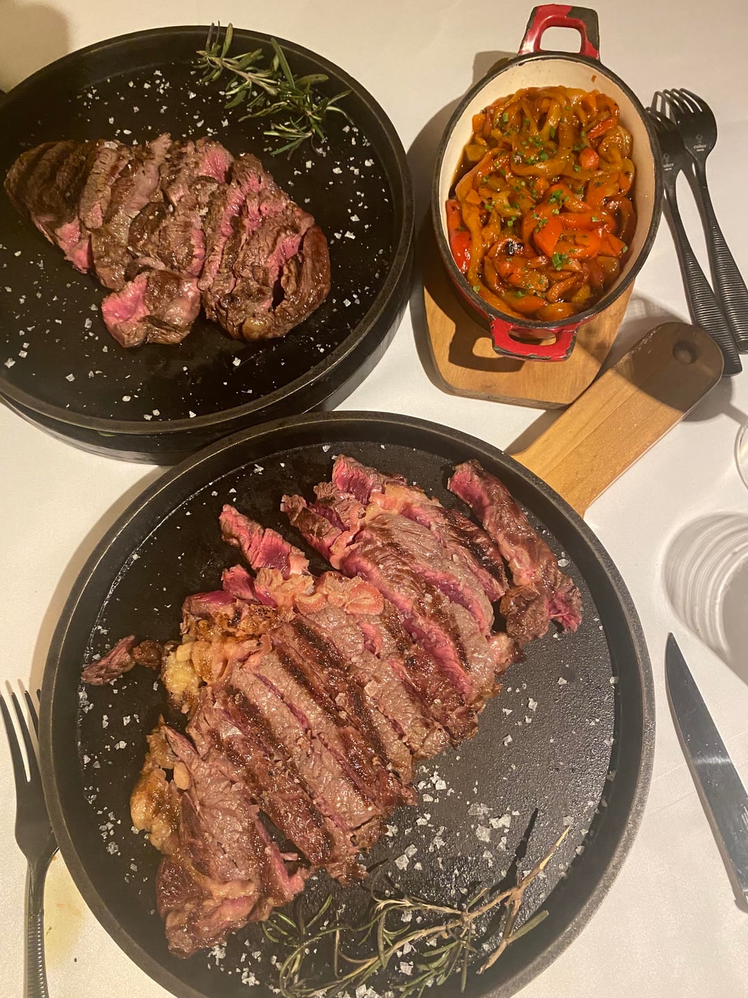Menu labeled as Ribeye steak, 350g | Retinta [Cádiz] and the peppers as Warm salad of roasted peppers