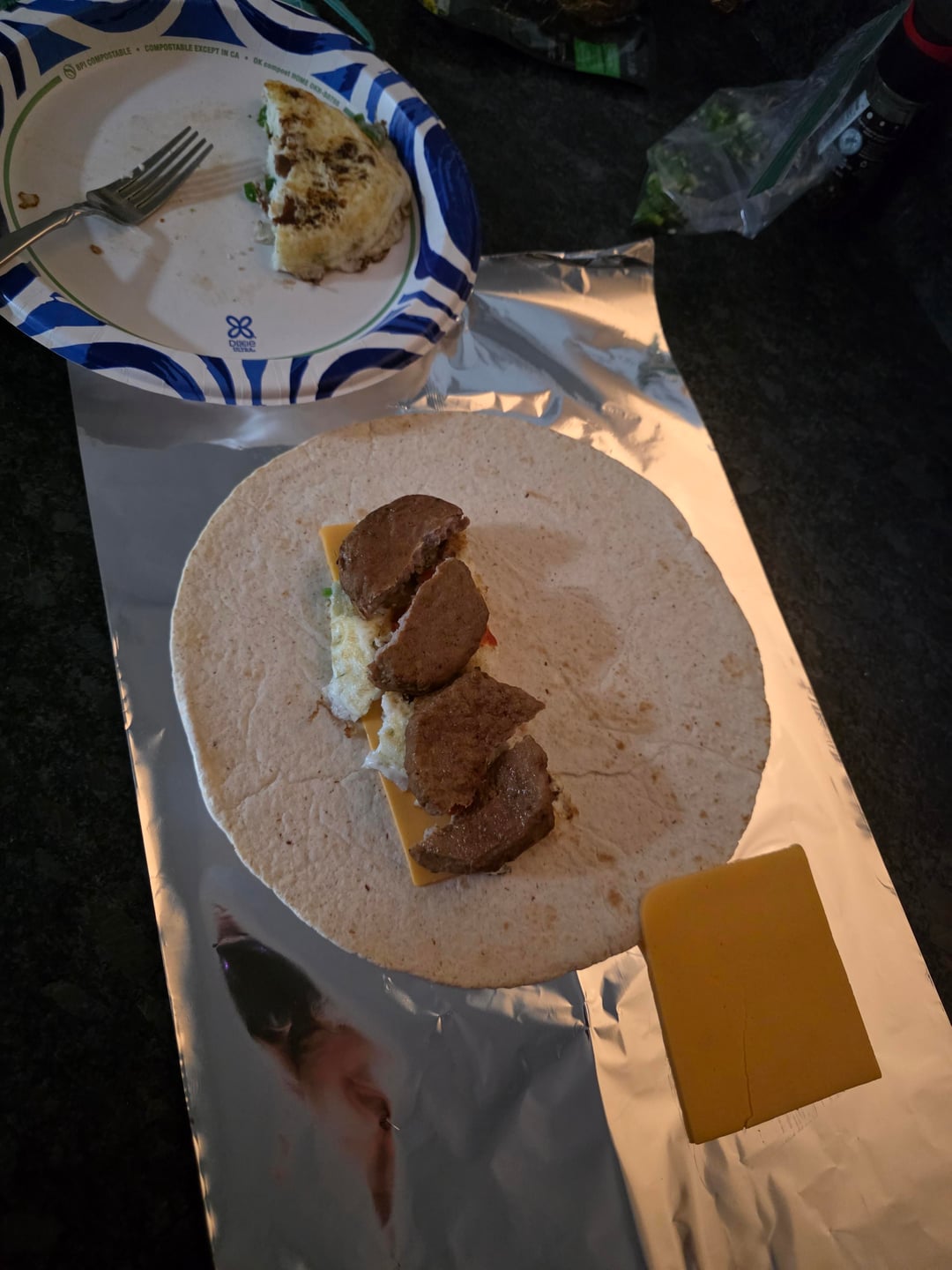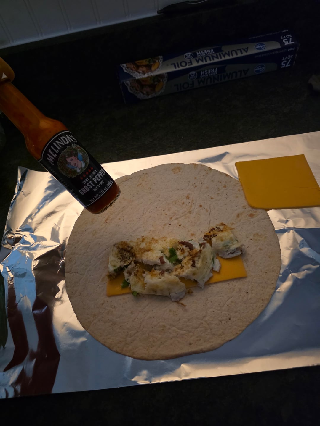 Quick breakfast for work tomorrow… Xtra large keto tortilla, egg whites with jalapeño and bacon, American cheese (melts when heated later), 2 turkey sausage patties and some ghost pepper sauce… ill put it in the food warner at work at 5am and by break time at 9am its cooked and gooey and burning my mouth ready to get washed down by a sugar free RedBull