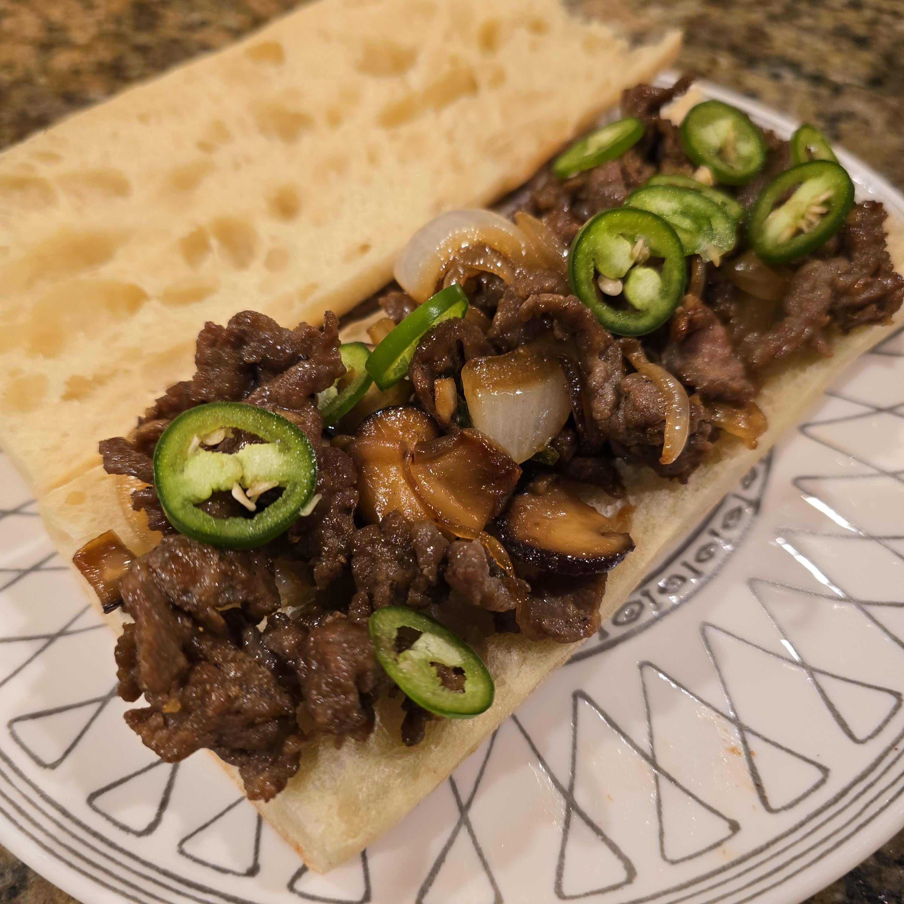 Thin-sliced bulgogi, sautéed onions and mushrooms, with a few jalapeño slices for a little kick.