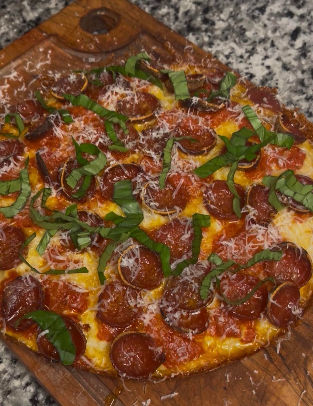 Pepperoni, pecorino and basil is my favorite combo for toppings. Looks great!