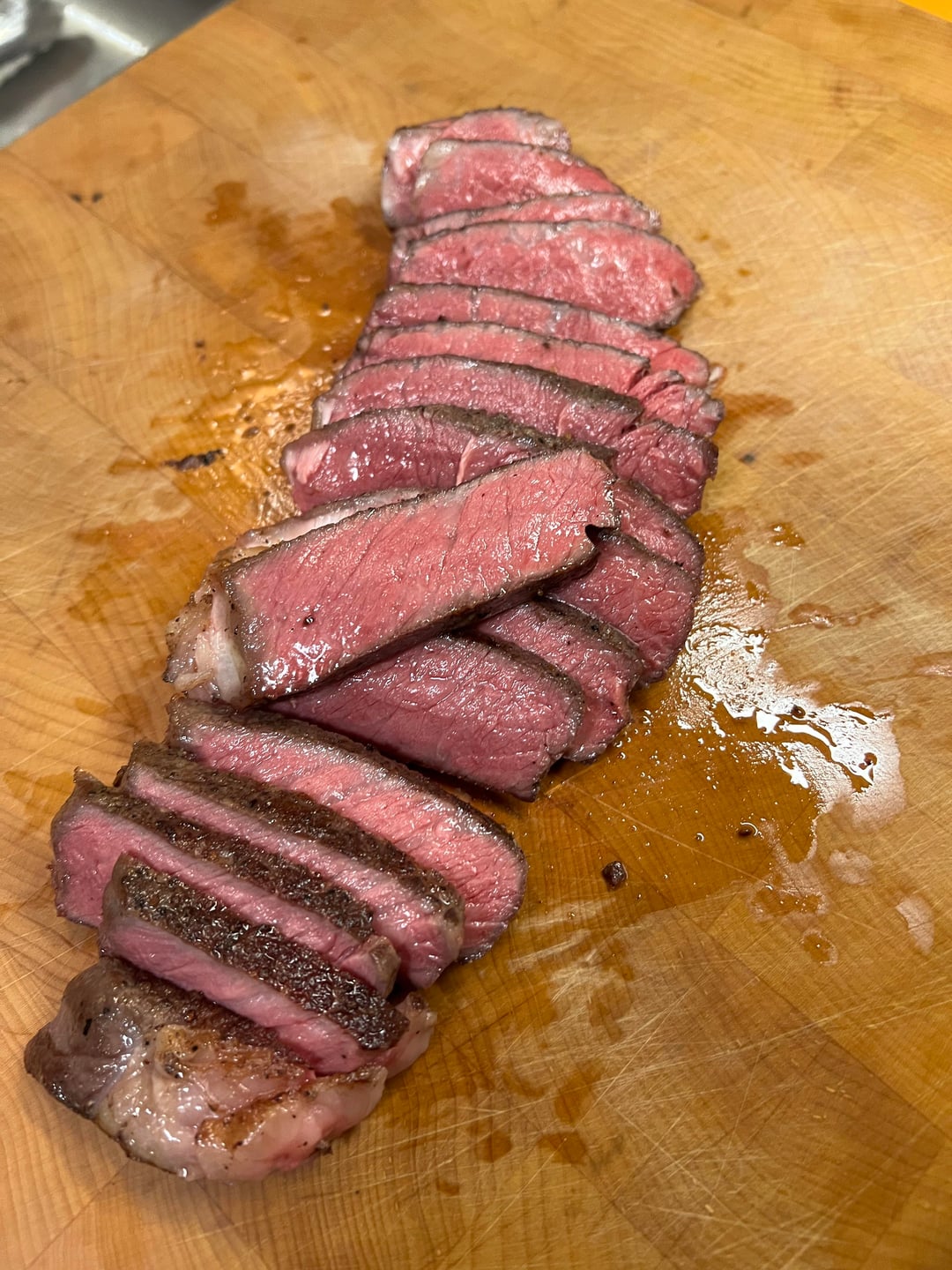 133 for 2 hrs, seared in cast iron. Made mighty tasty steak quesadillas last night with caramelized onions and roast red pepper.