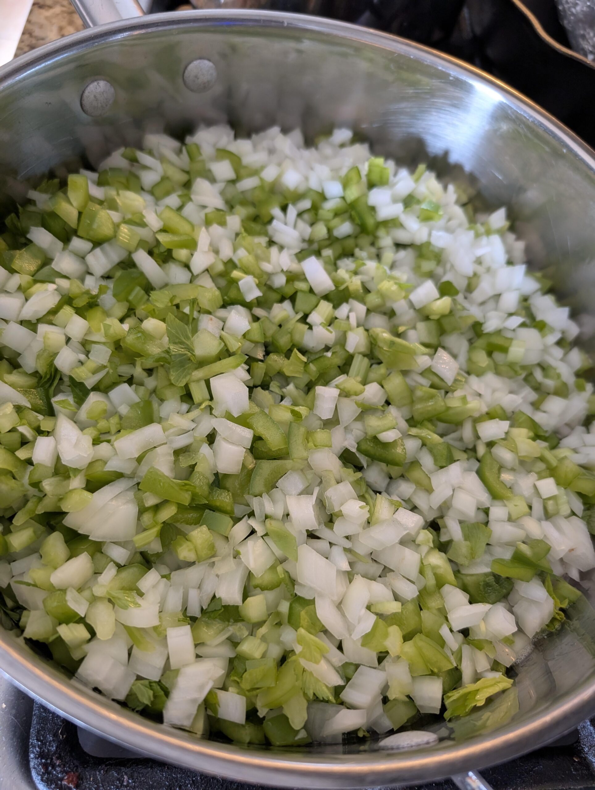 Onion, bell pepper, and celery sauteed in bacon grease.