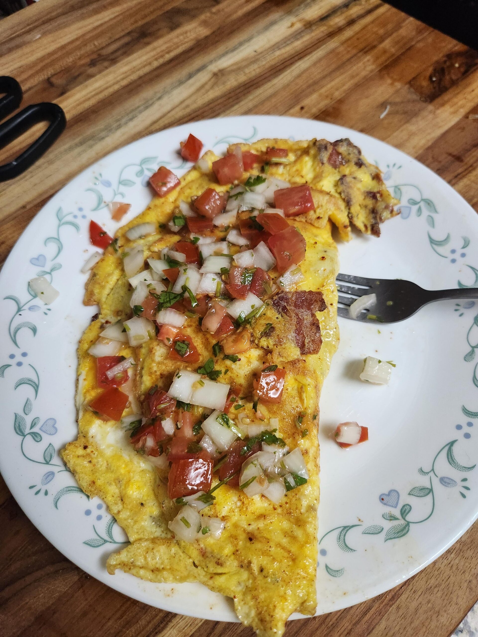 5 eggs 4 bacon plus some sobermade salsa. Don’t fry bacon with no shirt on.
