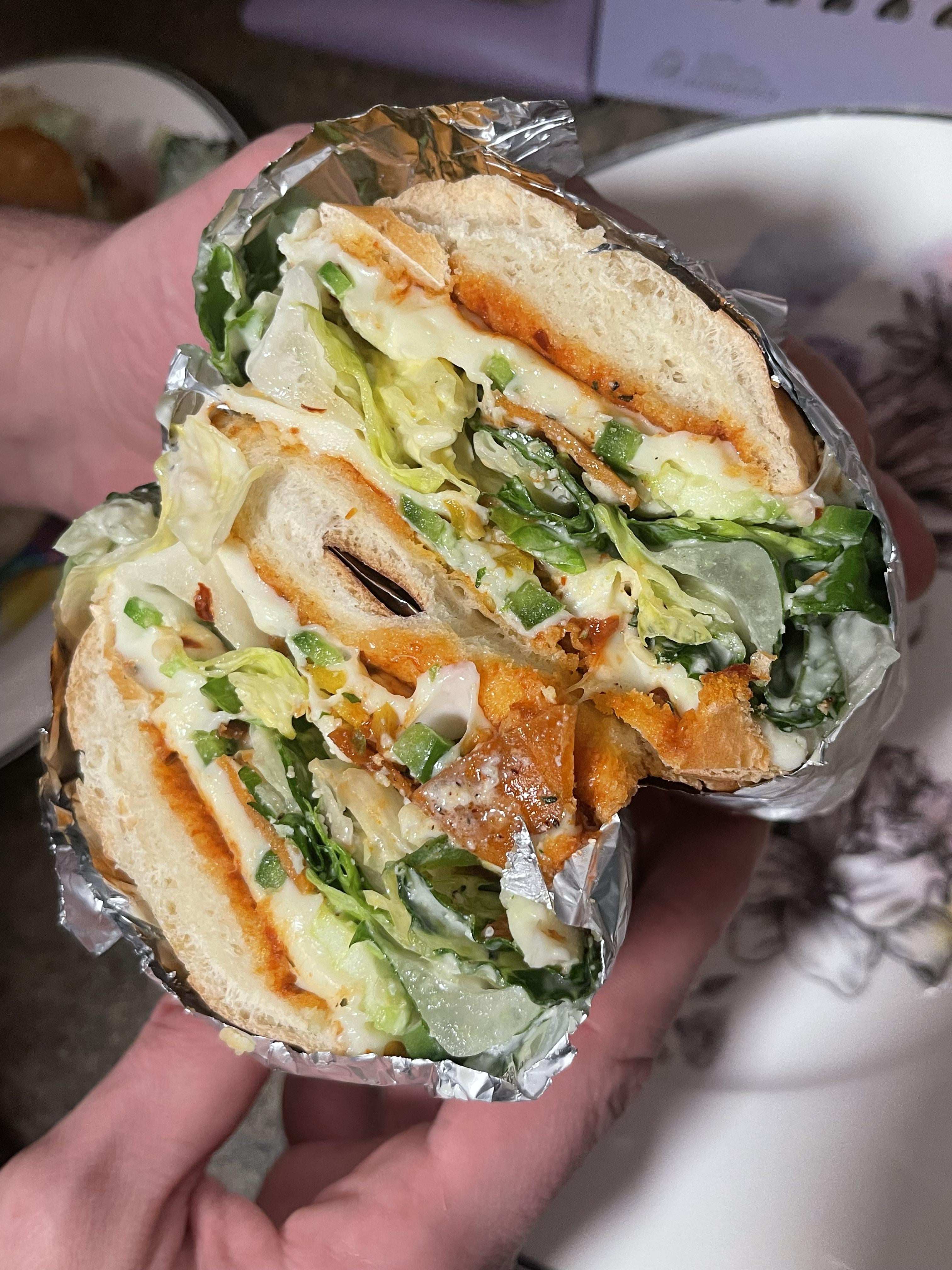 baguette sliced with pizza sauce and cheese on both sides, with veggie pepperoni (you can use real obv) jalapeno, habenero, and caesar salad in between.