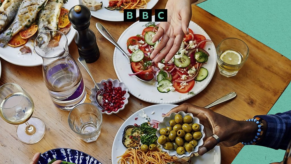 Image: A family is eating together. The wooden table is covered in brightly coloured plates of salads, pastas and olives. Hands reach over to take some of the food. (Credit: Getty/Compassionate Eye Foundation/Natasha Alipour Faridani)