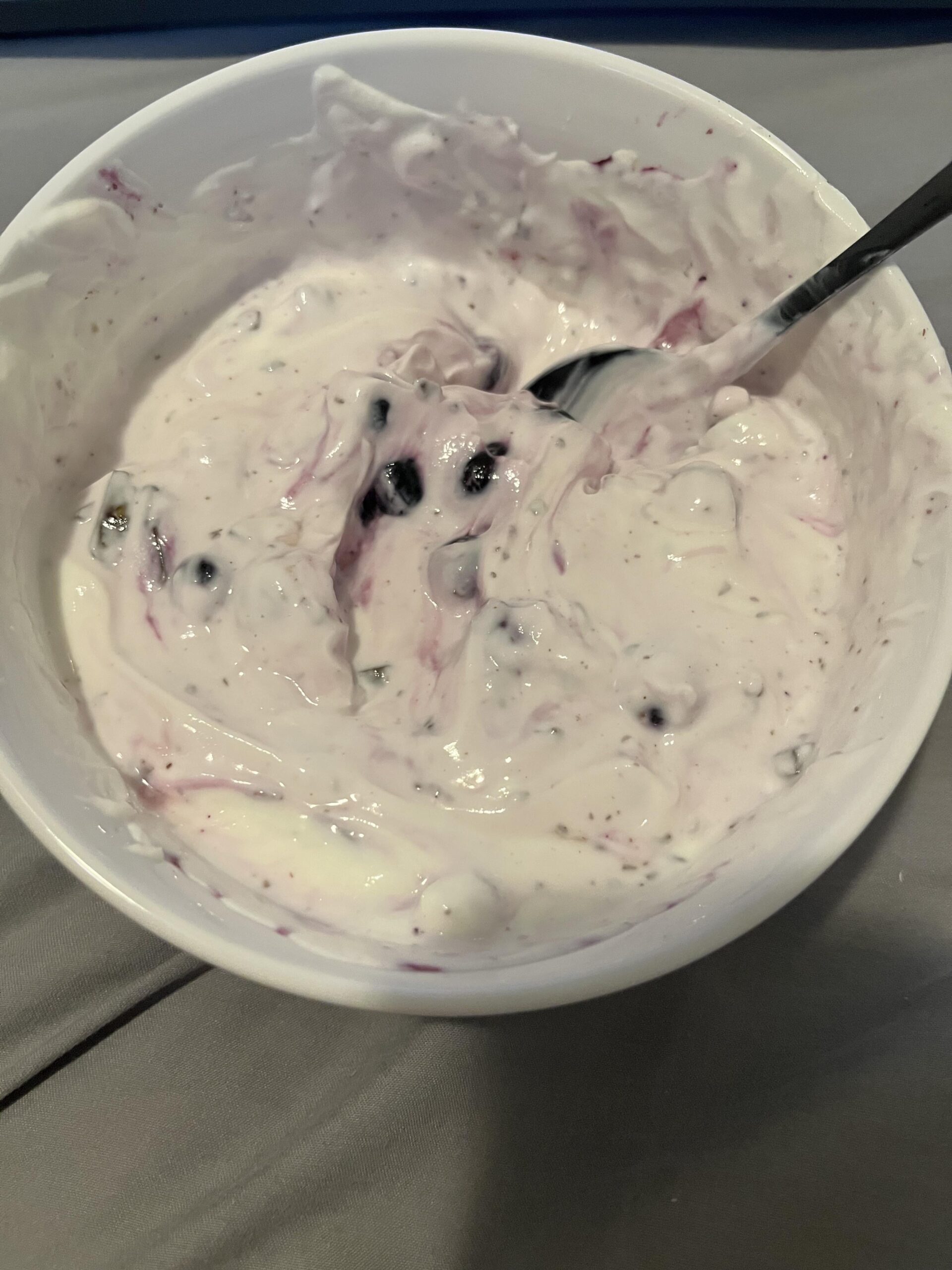 Based off Sillz’s genius bowl. 425g Oikos triple zero vanilla, 1 tbsp honey, 100g frozen blueberries, 28g 60% chocolate. 514 calories. Can remove honey and add protein powder. Wonderful dessert/meal. by thirsttrap123 Dining and Cooking