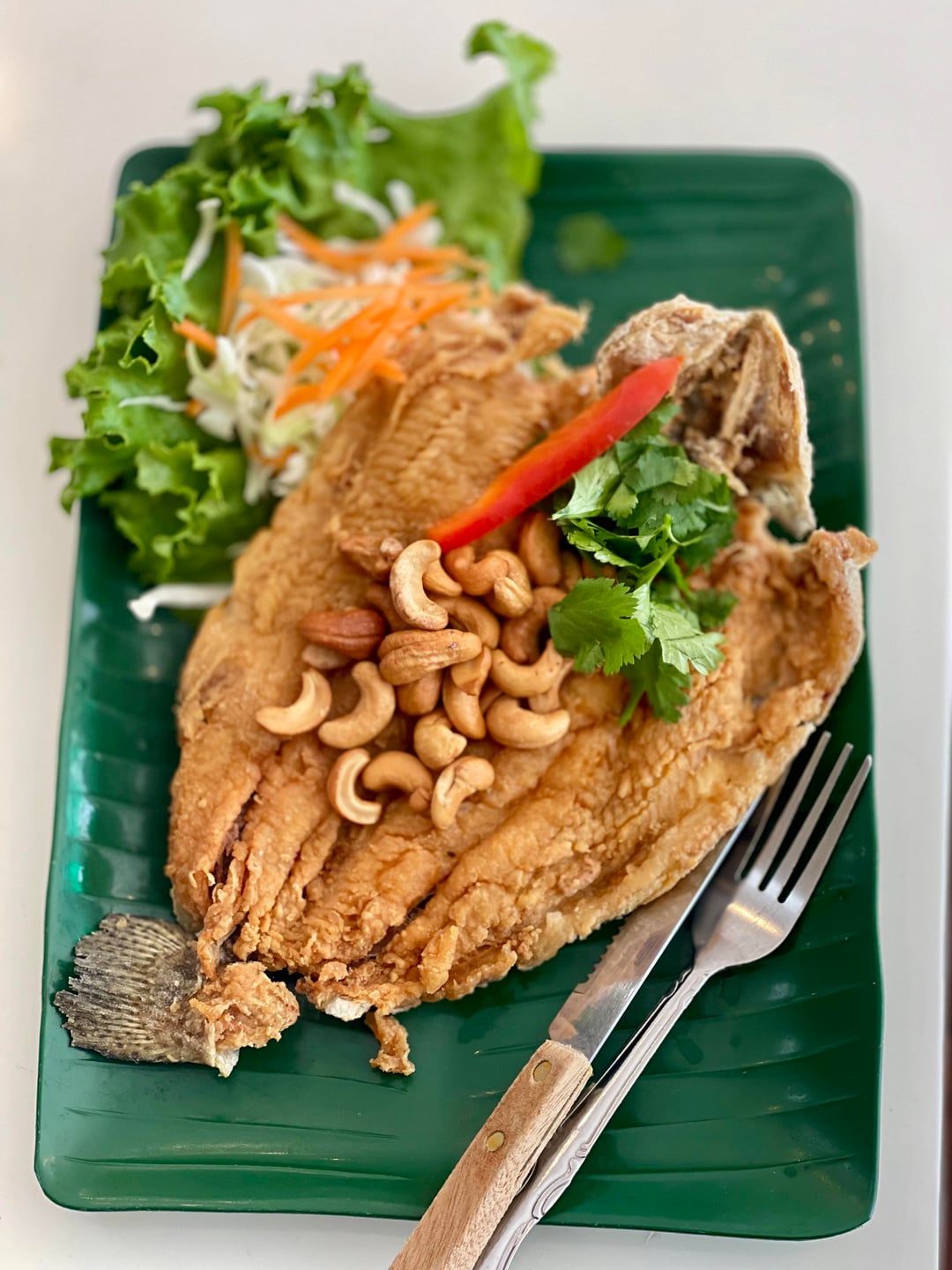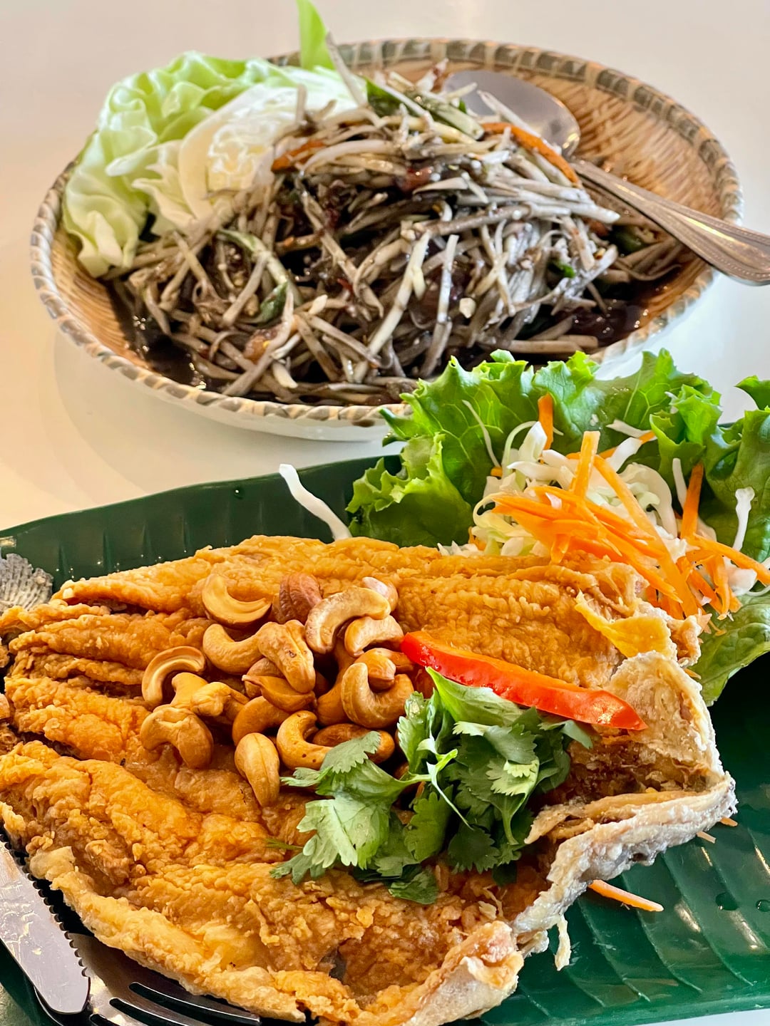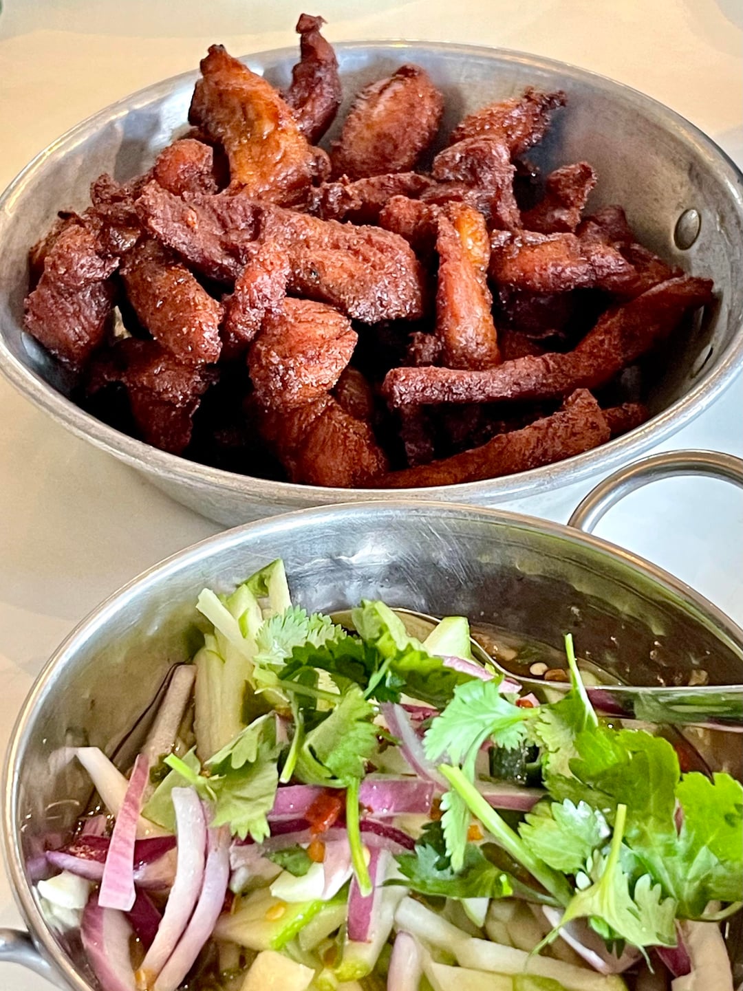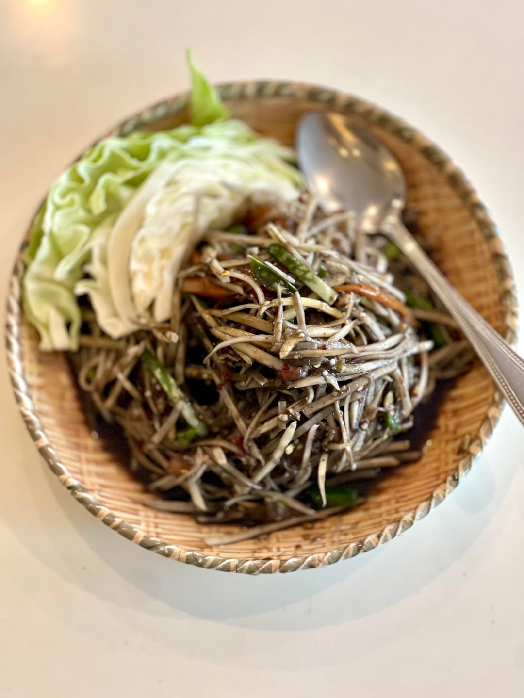 Lacha Somtum for Christmas lunch in Thai Town. We ordered deep fried trout with green apple, onion, chili, and lime juice on the side, somtum with salted black crab, bowl of egg noodles with wonton and barbecue pork, pad krapow with ground chicken, and pork jerky. It has been awhile since we ate here. They offer several varieties of somtum or Thai papaya salad. Sweet, sour, spicy, or combinations of those taste preferences. Authentic Thai dishes served here and a go to for local Thais. Lacha Somtum also offers Thai hot pot but this is better with 3-4 more people. There is only street parking and Jumbo’s Clown Room is two doors down. Bangluck market and Sanamluang is across the street. Happy holidays to all.