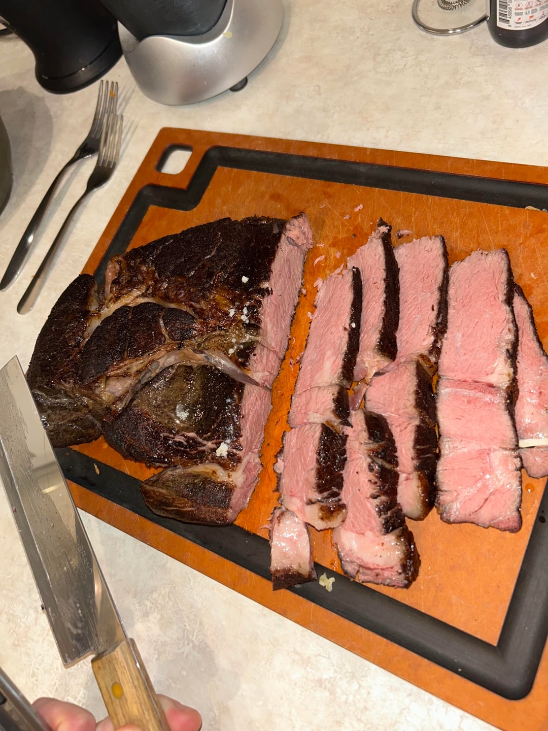 While I agree with your assessment that you over seared, I go 137 and normally get a little more red. I sear with a weed torch, so Hot and Fast.