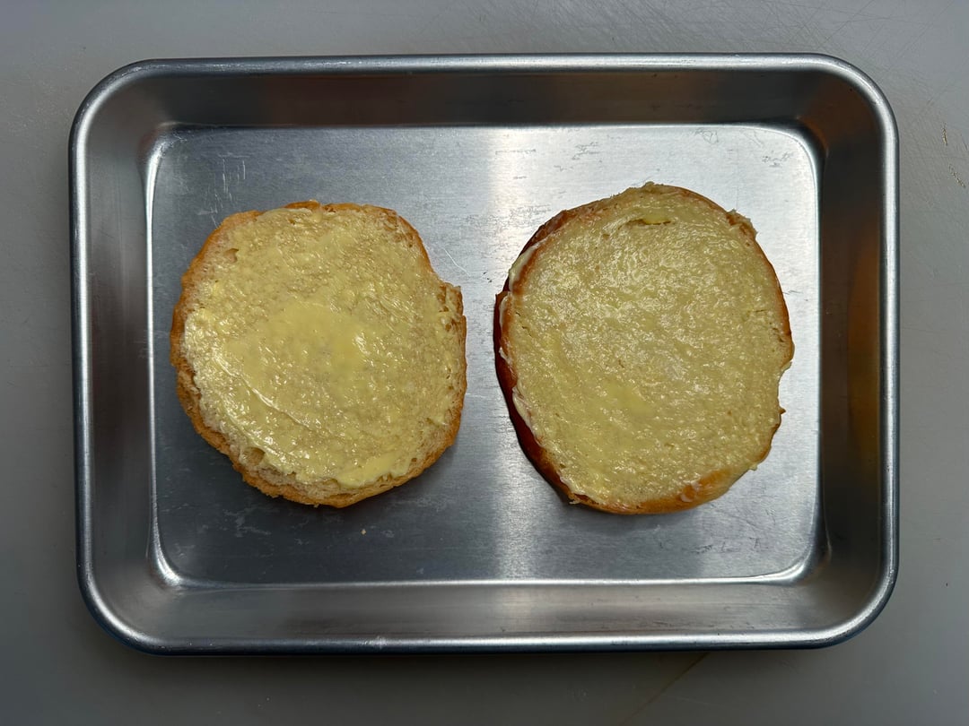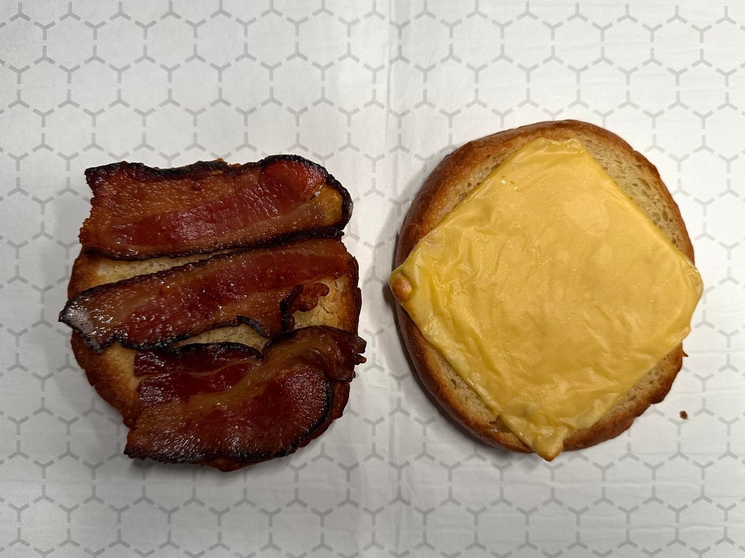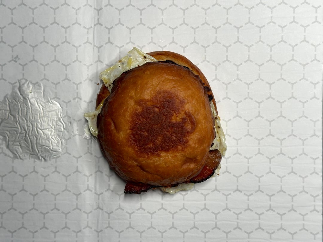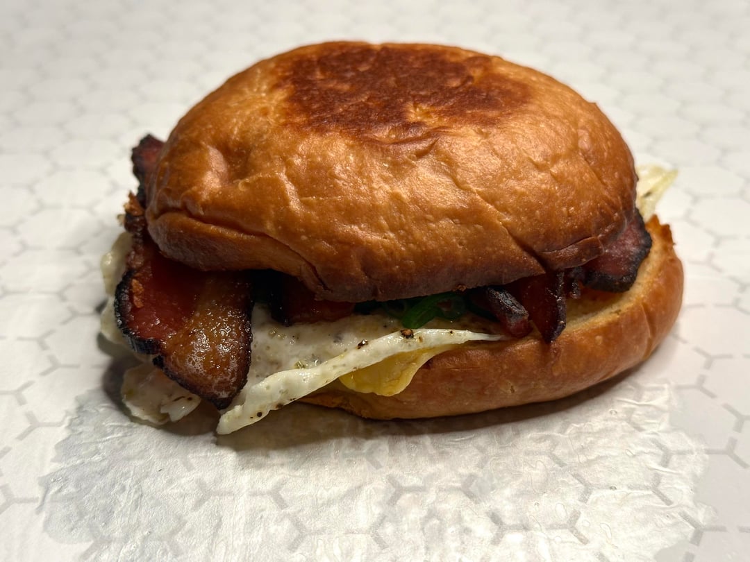 Over medium egg, bacon, American cheese, scallions, and Marie Sharp’s Nopal Green Habanero hot sauce, on a buttered and toasted homemade bun.