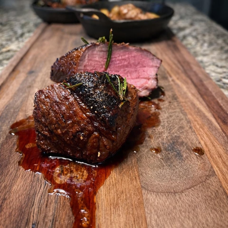 [homemade] Picanha, reverse seared at 195 C, finished in cast iron with peanut oil, butter and rosemary. Rested for 14 mins and remaining juices from the pan added.