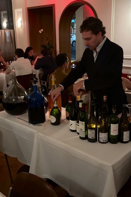Many tables had ordered deep enough into the crus to earn their own decanters, and a central table in the dining room is dedicated to displaying the night’s ordered bottles, while a murderers’ row of big-dick empties circles the dining room as décor. If you want back vintages of Dujac, Roulot, Rayas, and Haut-Brion, they are here, matched in grandeur by the scrotal magnificence of a ten-liter demijohn of 20-year-old Mas Amiel Maury brought round on request with dessert.