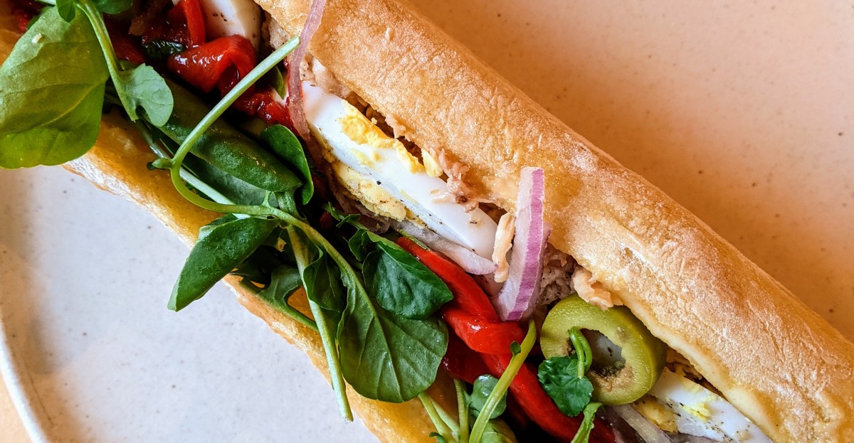A baguette from Nido overflows with greens, hard-boiled egg, onions, peppers, and tuna.