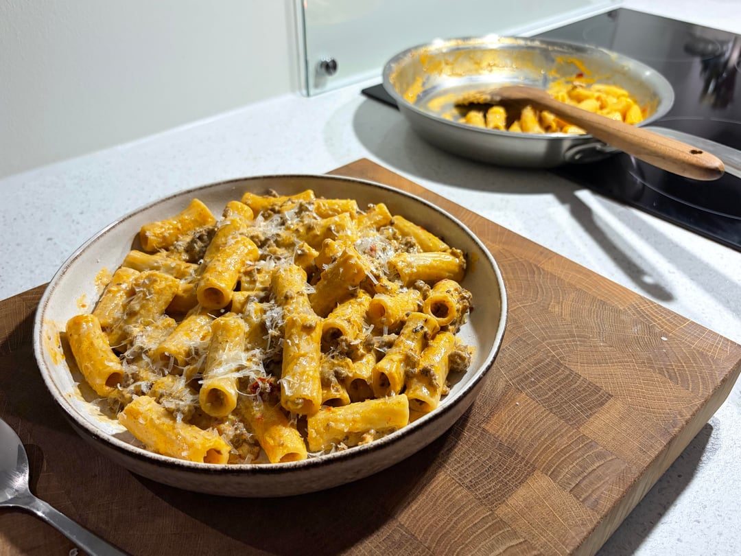 Made a simple pasta tonight, using some spare minced meat and a batch of leftover (previously boiled) pasta I had sitting in the fridge. The pasta had been sitting for a couple of days, so it had dried enough to handle another few minutes of cooking in today’s sauce, whilst still staying al dente in the end. Funny how pasta essentially uncooks itself after some time in the fridge.