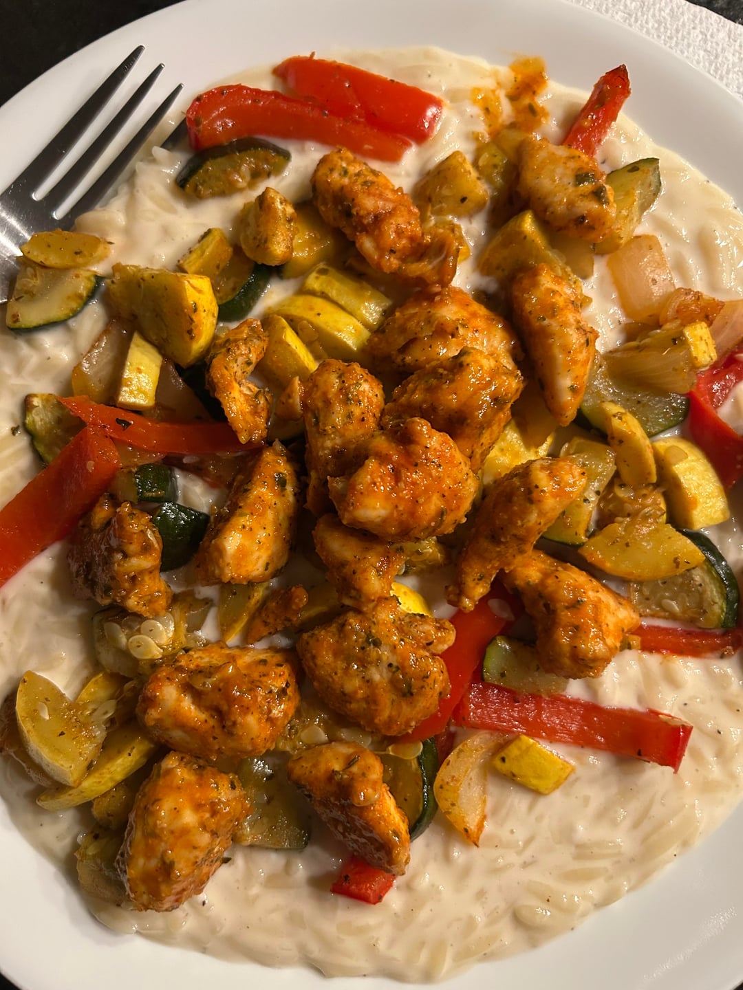 Dinner-creamy orzo, veggies, and buffalo chicken
