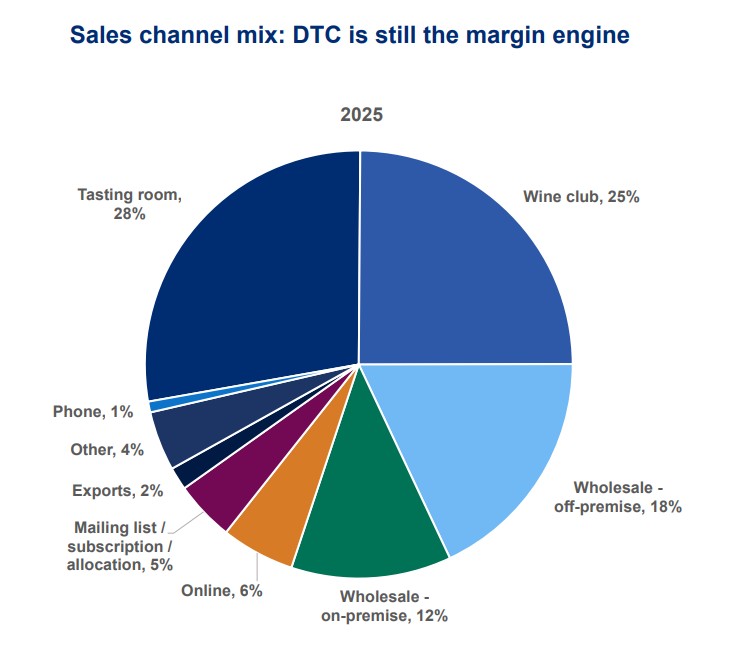 Direct-to-consumer sales remain crucial for premium wineries, accounting for more than half of average revenue. Wholesale channels contribute about one-third but have become less reliable sources of growth. Regional differences are notable: areas like Paso Robles, Virginia, Texas, and Santa Barbara show especially high DTC shares.