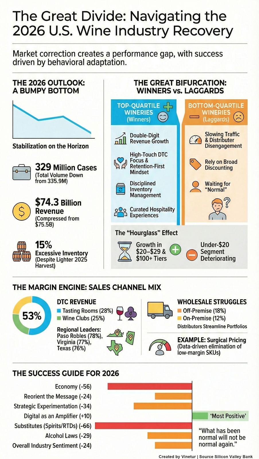 Wineries best positioned for future success are those adapting quickly—focusing on club retention, hospitality-driven experiences, targeted digital engagement, simplified product lines, and new approaches to pricing and access models for tasting rooms. The report stresses that passive strategies relying on walk-in traffic or distributor-driven sales no longer work; active consumer engagement is now essential.