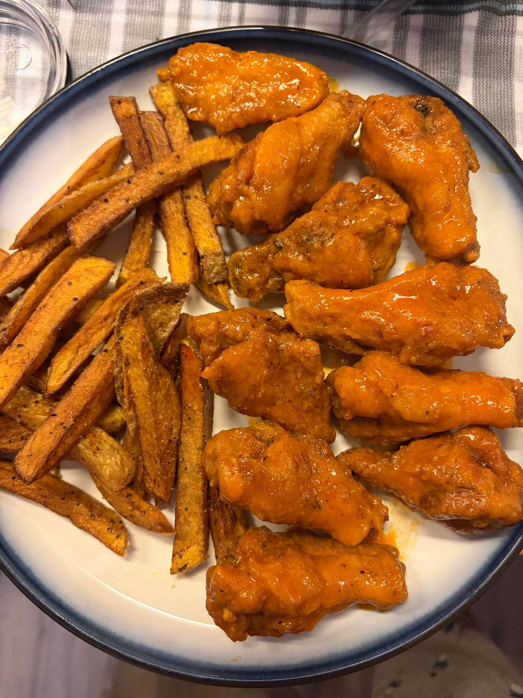 First picture is after the first fry for about 10 minutes, then I refried for about 3 minutes after letting them sit. Coated in a pretty simply made buffalo sauce.