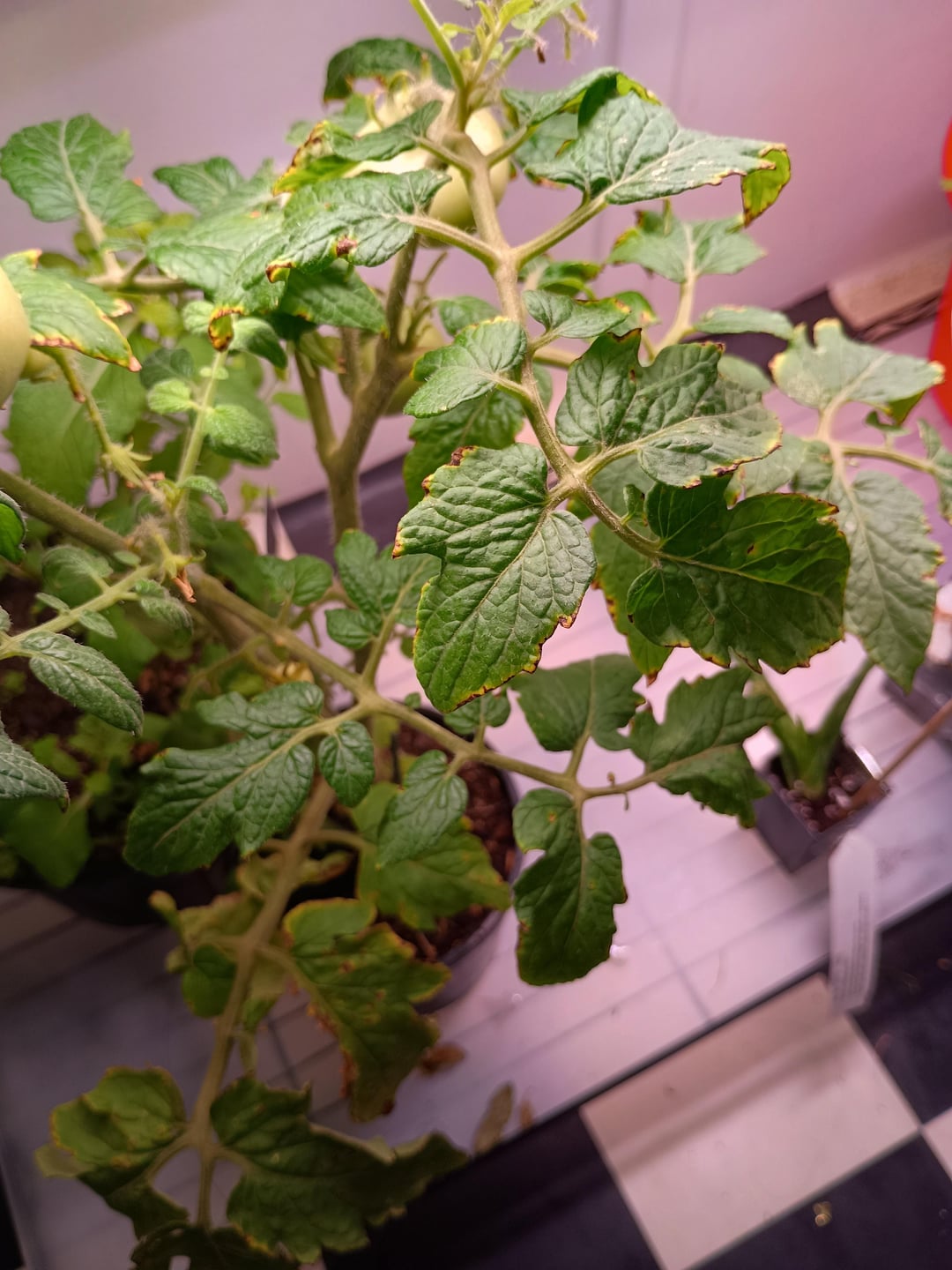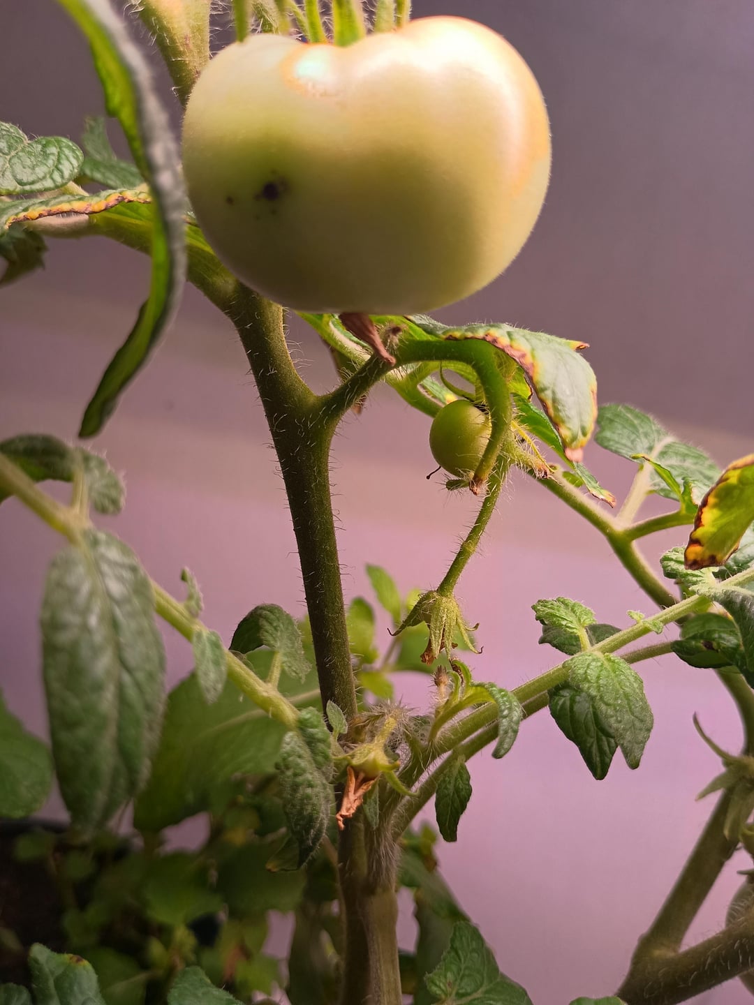I'm looking on advice on my tomato plant. Some tomatoes aren't a lovely green colour of a typical and healthy developing tomatoe. The second picture needs to be at fullscreen so the black spot can be seen. And some leaves have discolourisation. There are still some tomatoes budding that doesn't have the black/brown discolourisation.