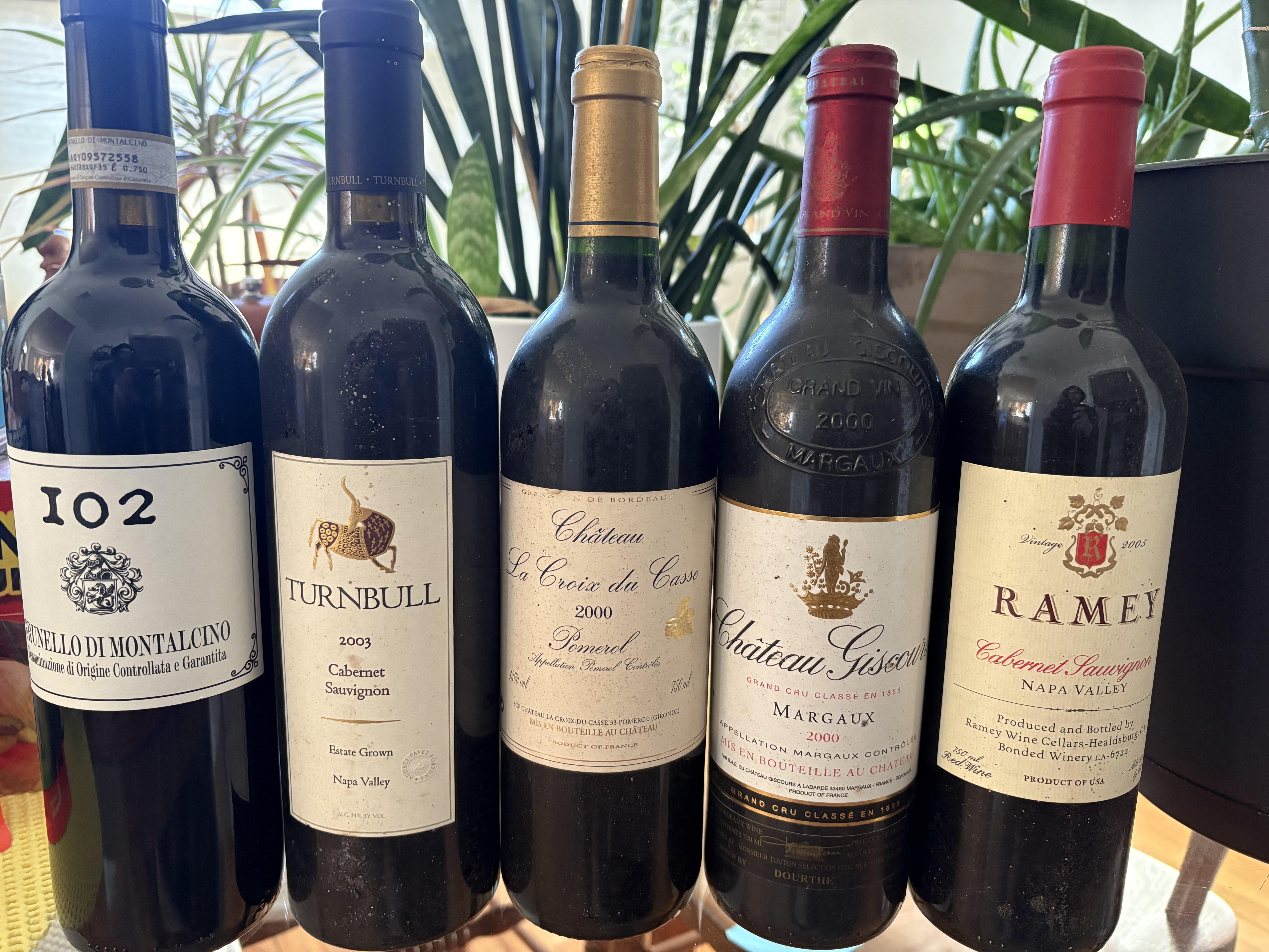 I’d open the Turnbull (2003 is not a great vintage) and Ramey and do side by side with a nice meal, same with Giscours and the Pomerol on a different evening. Know nothing of the Brunello, but 2011 is a drink now vintage.