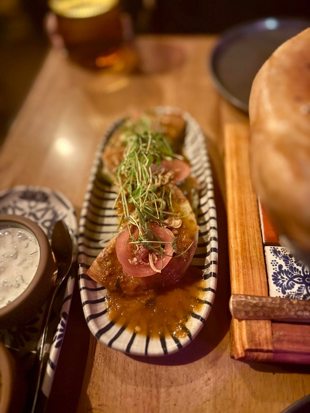 Had dinner at Mirra after our Bucktown engagement photo session tonight and it ended up being one of the highlights of the day. The menu pulls together Indian and Mexican influences in a way that feels creative without being gimmicky, and every dish we tried had its own standout moment.