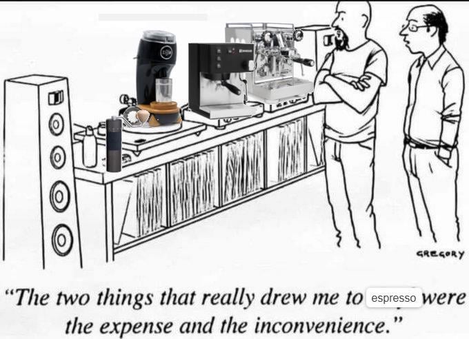 “I’ve never had a great shot of espresso but as soon as I buy a better machine and a new grinder and calculate the right formula for water to coffee and get the right amount of minerals in the water and the moon phase is right …”